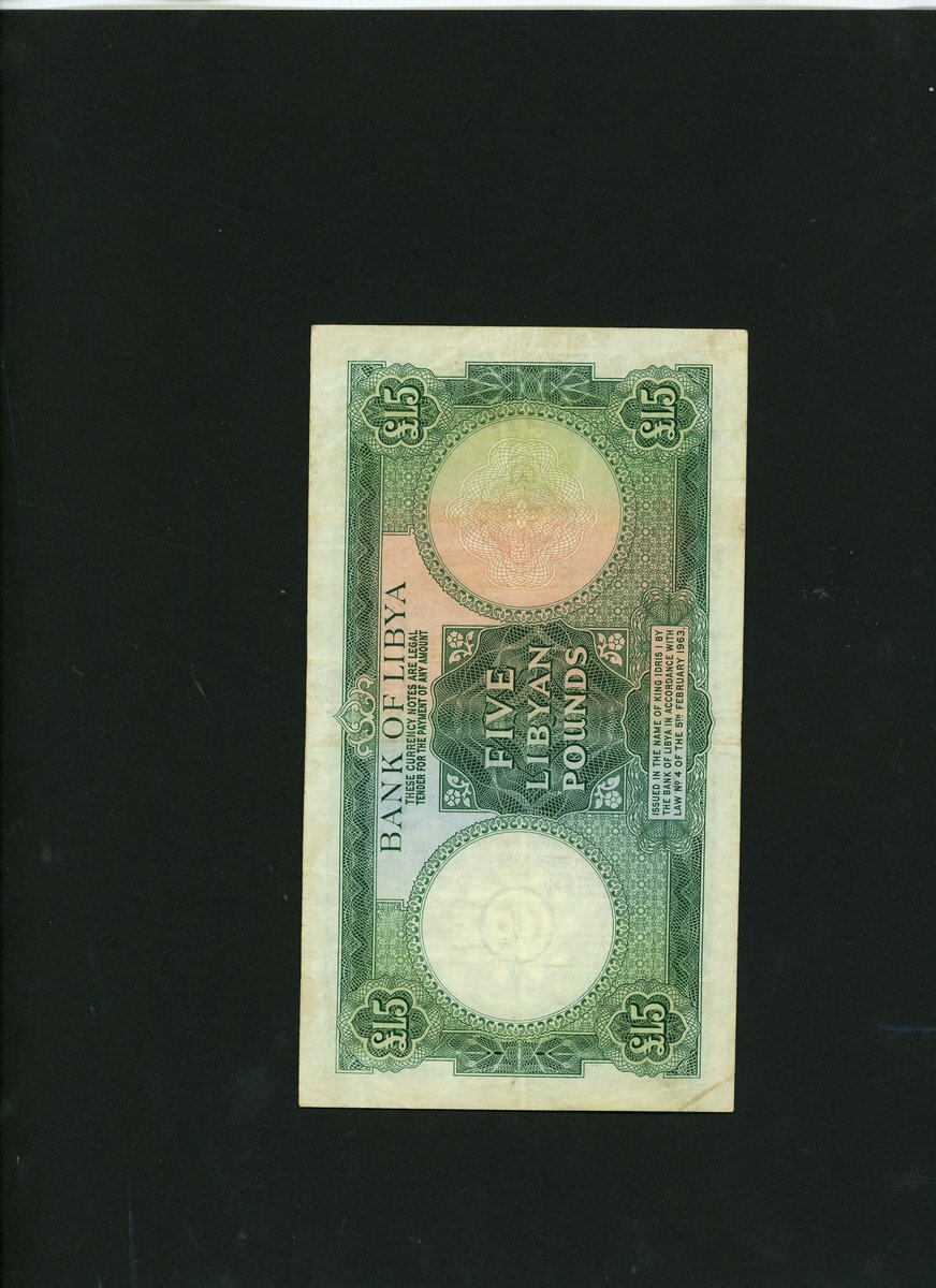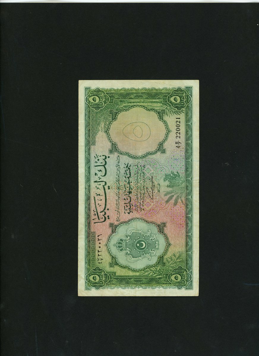Bank of Libya, 5 pounds, ND (1963), serial number 4 B/7 220021, green on multicolour underprint, arms at left, Khalil Al Bennani signature