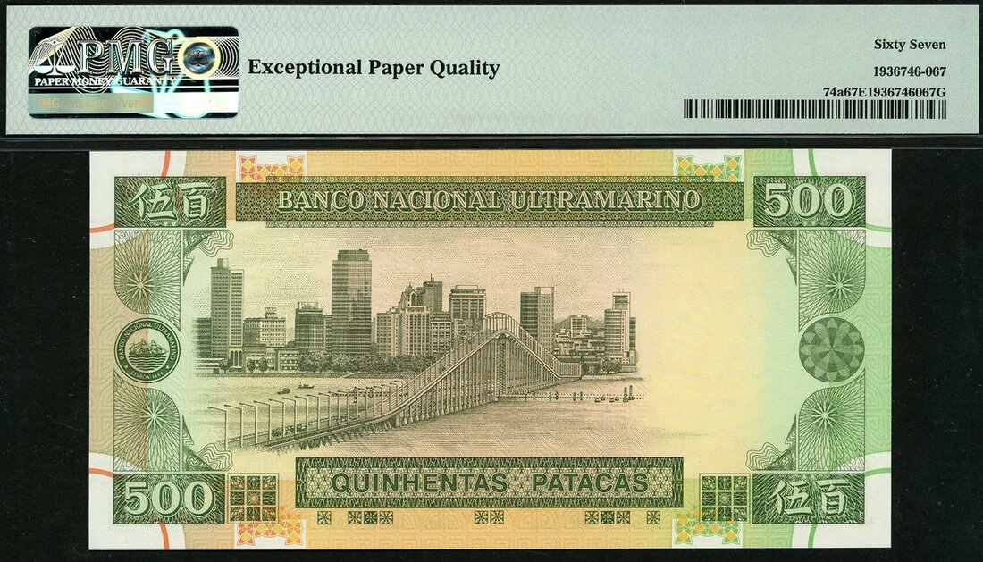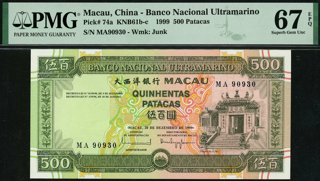(x) Banco Nacional Ultramarino, Macao, 500 patacas, 1999, serial number MA 90930, green and pink and orange, temple top left