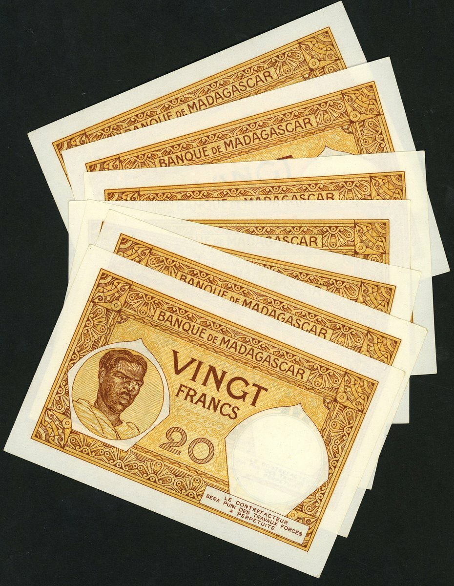 Banque de Madagascar, consecutive 20 francs (6), serial numbers V.360 0841-0846, 0848, (Pick 37, TBB B204b), centre fold, extremely fine, good run of consecutive notes (6 notes)