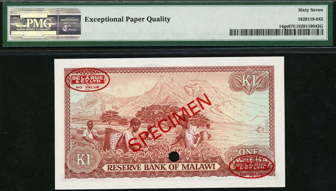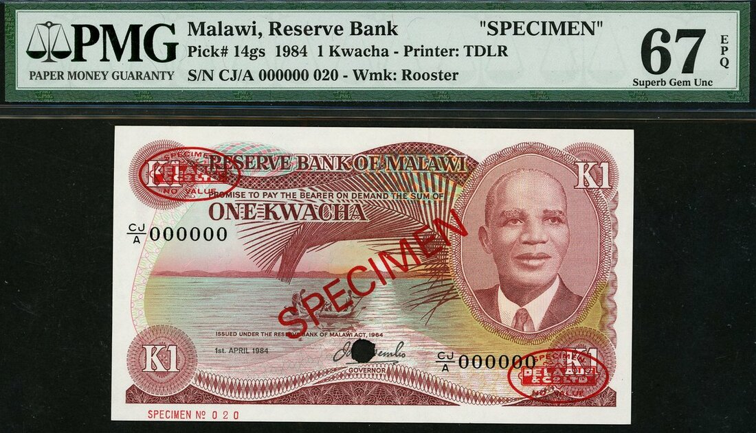 Reserve Bank of Malawi, specimen 1 kwacha, 1st April 1984, serial number CJ/A 000000 020, (Pick 14gs, TBB B114gs), red oval DLR SPECIMEN and diagonal SPECIMEN overprint, cancelation punch hole, in PMG holder 66EPQ Gem Uncirculated, only 3 of this date graded, and this of the highest grade on the population report at the time of cataloguing, scarce