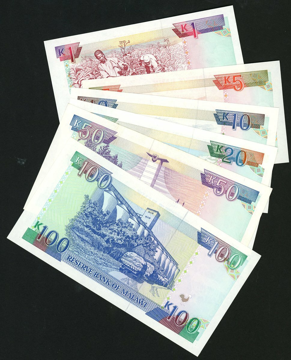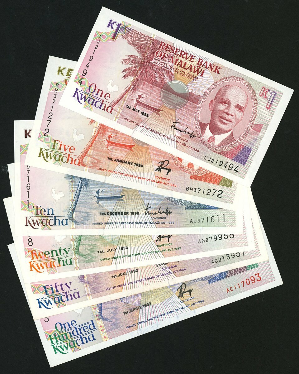 Reserve Bank of Malawi, complete set of the 1990-94 issues, including 1, 5, 10, 20, 50 and 100 kwacha,