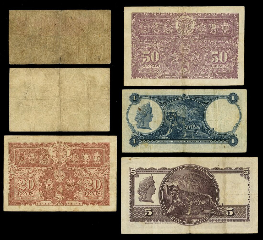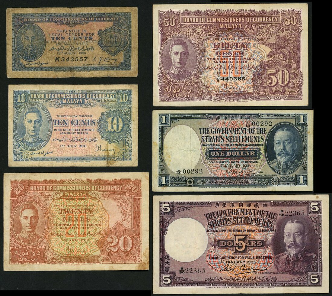 Board of Commissioners of Currency Malaya, 10 cents (2), 20 cents, 50 cents, also including Government of Straits settlements 1 (serial number 00292), and 5 dollar 1935