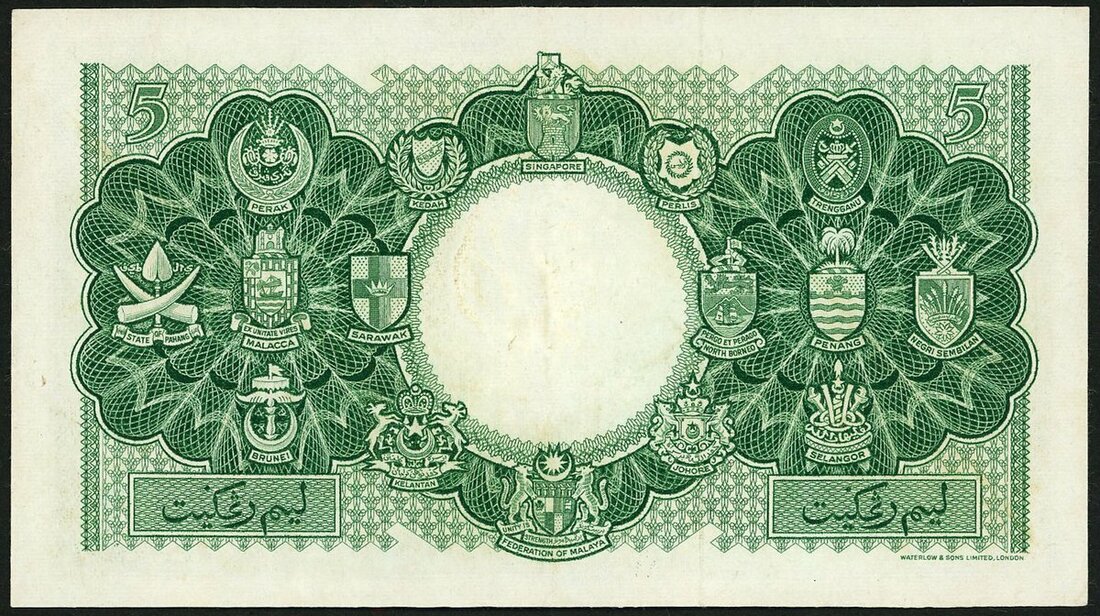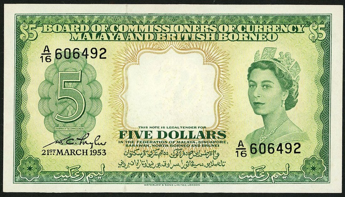 Board of Commissioners of Currency Malaya and British Borneo, $5, 21 March 1953, serial number A/16 606492, green, Elizabeth II at right, value at left, Taylor signature