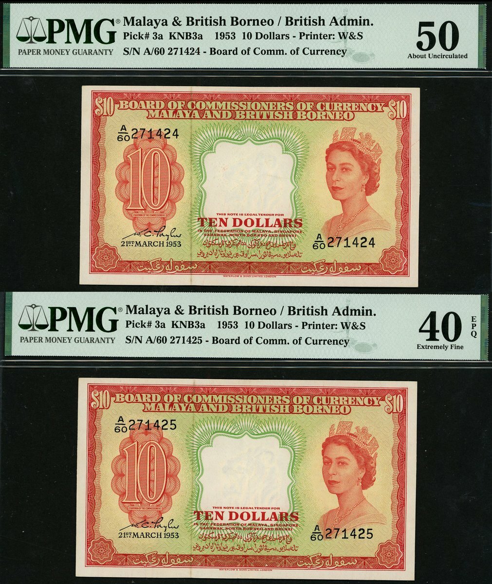 Board of Commissioners of Currency, Malaya and British Borneo, £10, 21 March 1953, serial number A/57 499408, red on green and multicolour underprint, Queen Elizabeth II at right watermark at centre, reverse red, coats of arms,