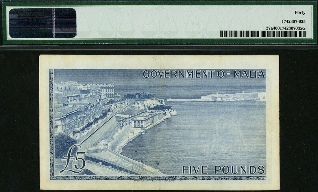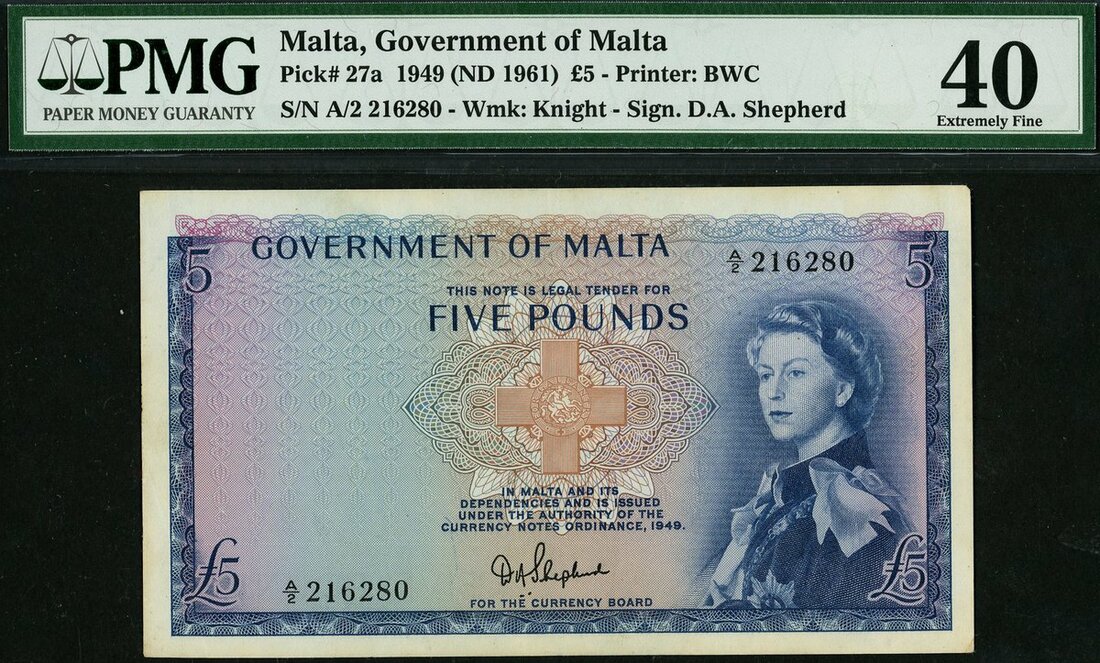 (x) Government of Malta, £5, ND (1961), serial number A/2 216280, (Pick 27a, TBB B126), in PMG holder 40 Extremely Fine