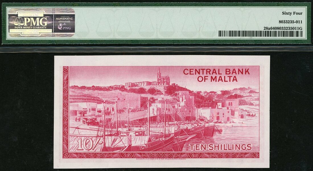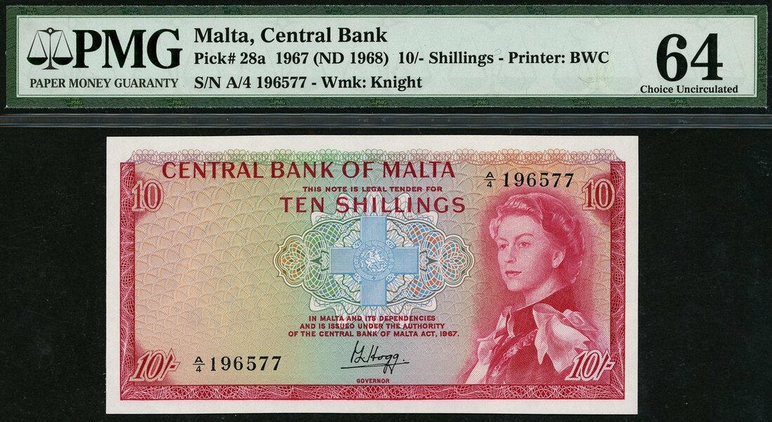 (x) Central Bank of Malta, 10 shillings, 1967 (ND 1968), serial number A/4 196577, (Pick 28a, TBB B201), in PMG holder 64 Choice Uncirculated