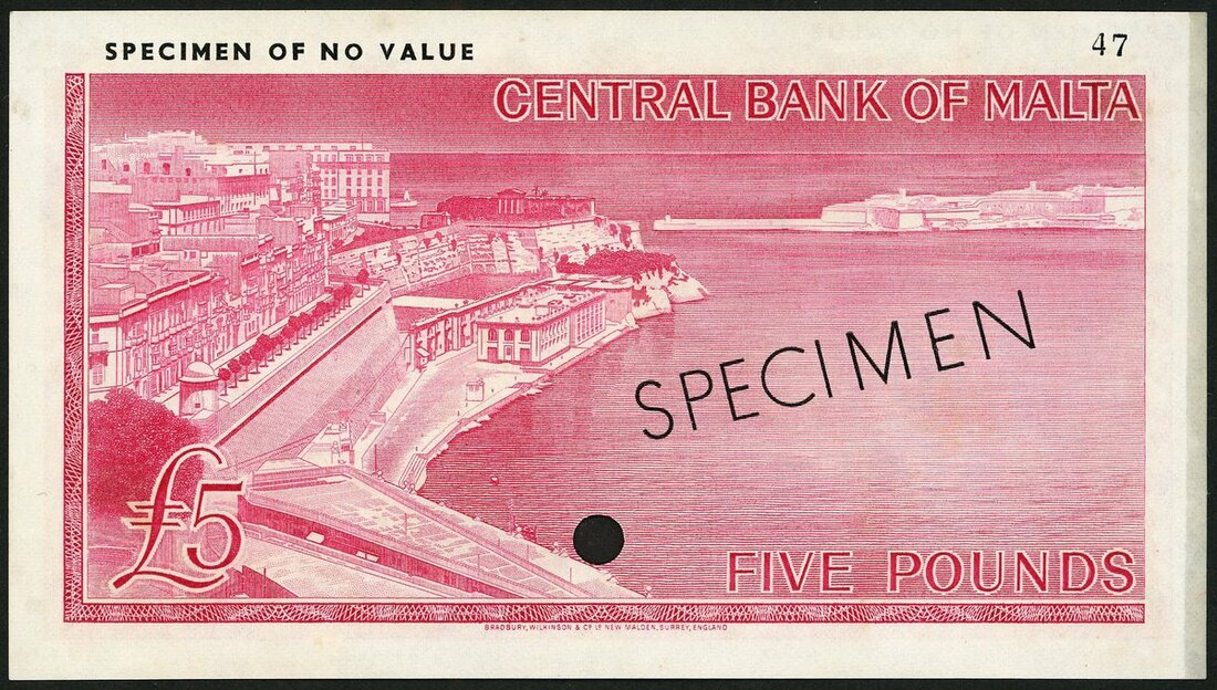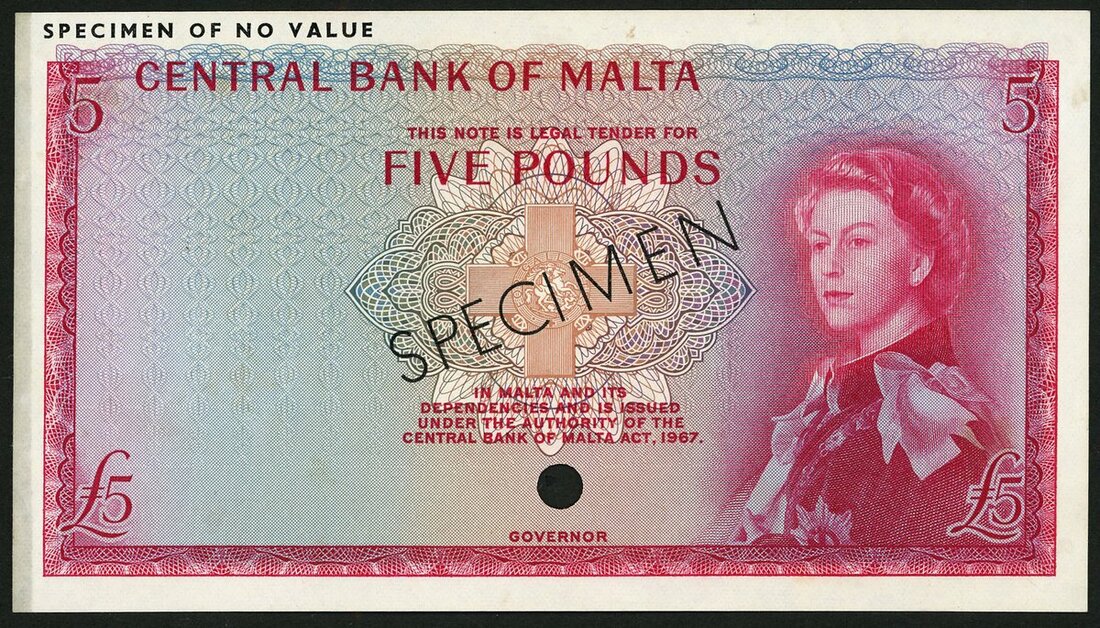 Central Bank of Malta, colour trial £5, ND, red and multicoloured, Elizabeth II at right, George Cross at centre, reverse red, Valetta harbour