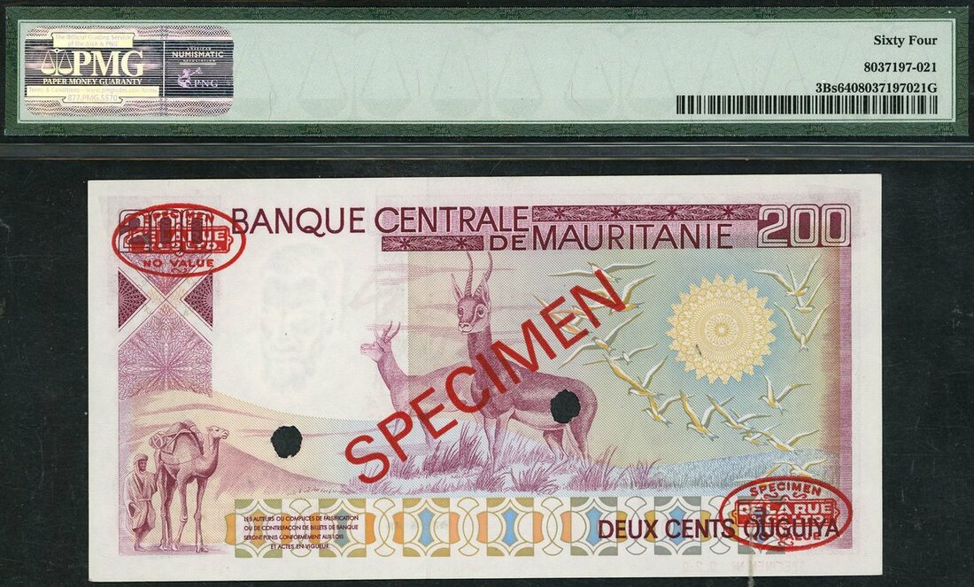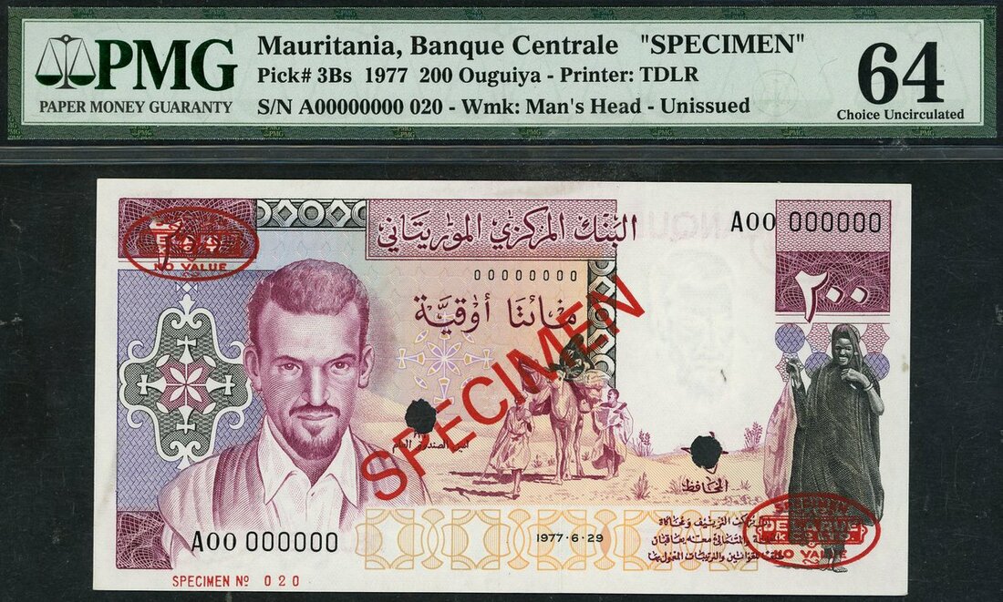 (x) Mauritania, Banque Centrale, specimen 200 ouguiya, 29 June 1977, serial number A00 000000, purple and multicoloured, man at left, maiden at right, camel at centre, reverse purple, antelope