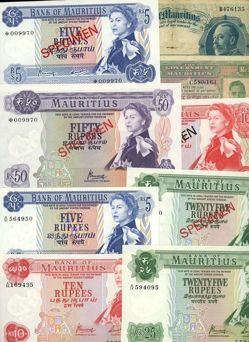 Government of Mauritius, 5 rupees, ND (1930), blue, George V at right, also George VI 1 rupee, ND (1940), green and lilac, also Bank of Mauritius 5, 10 and 25 rupees, ND (1967-), all Elizabeth II at right and a Franklin Mint specimen set, ND (1978),