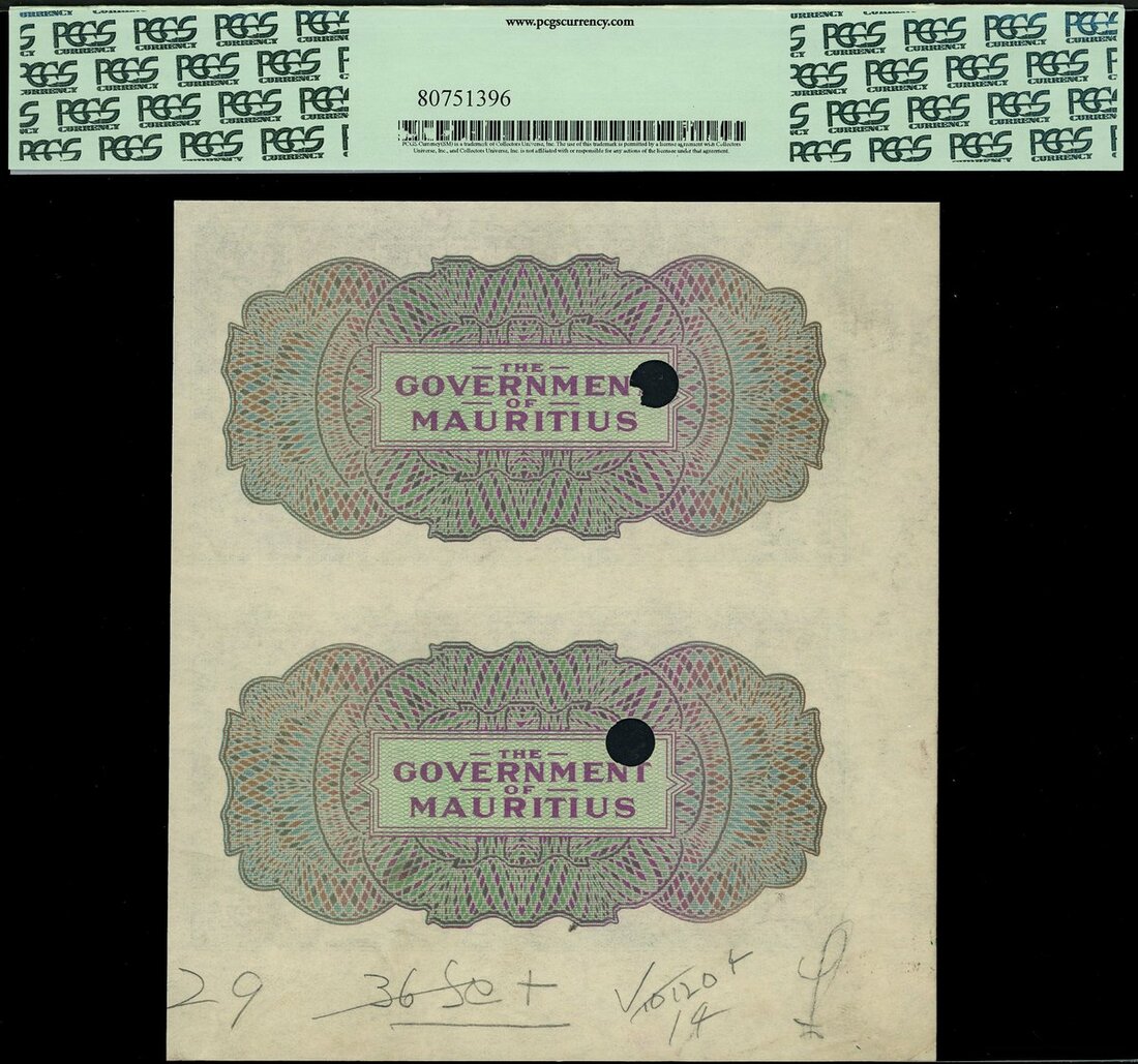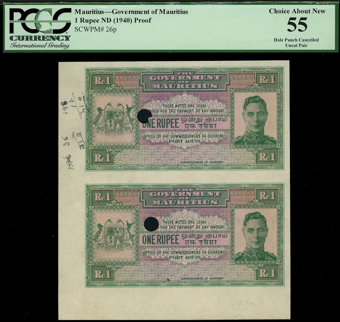 (x) Government of Mauritius, proof uncut pair of 1 rupee, ND (1940), green on lilac underprint, portrait of King George VI at right, no signature