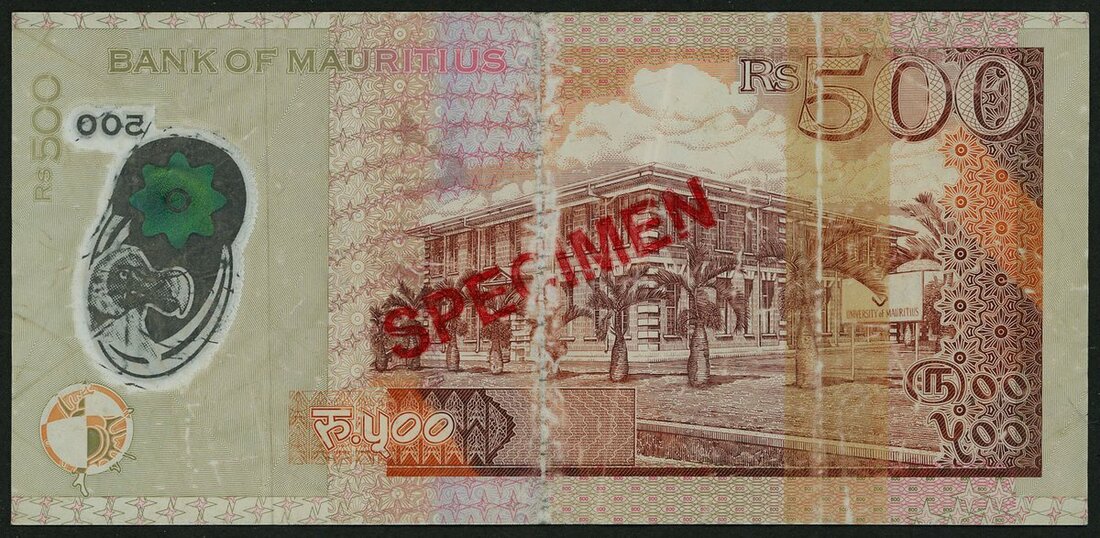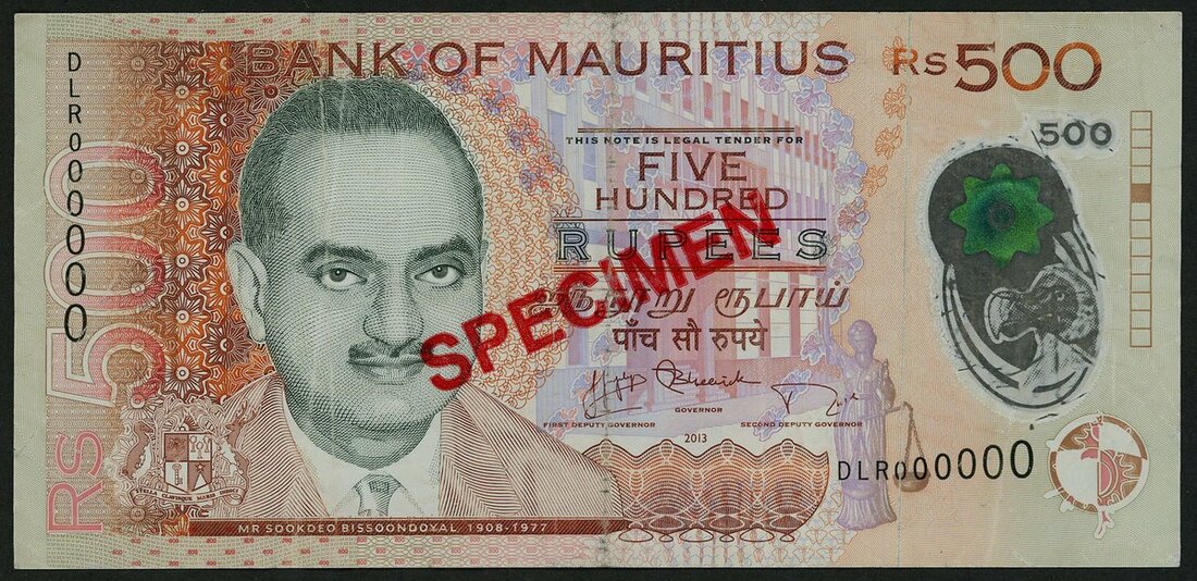 (x) Bank of Mauritius, specimen 500 rupees, 2013, serial number DLR 000000, (Pick 66s), rare specimen with DLR prefix, very fine