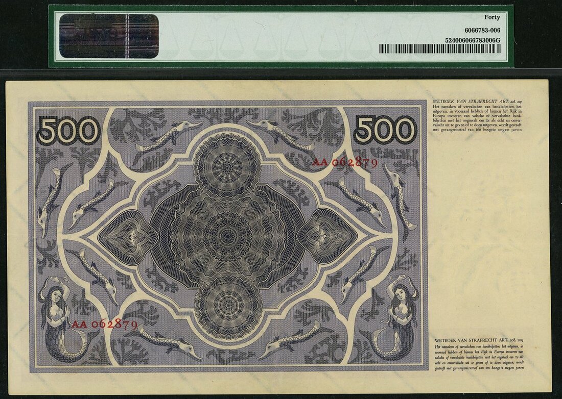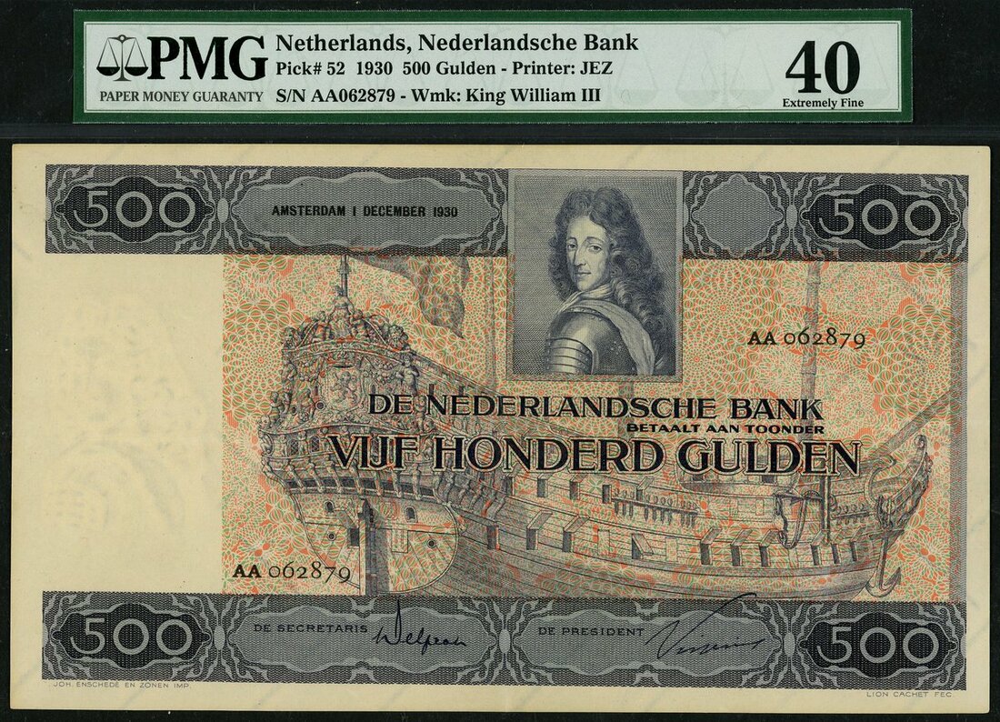 (x) De Nederlandsche Bank, 500 Gulden, 1.12.1930, serial number AA 062879, blue-grey and multicolour, portrait of King William III at top, the Hollandia at centre, reverse purple, '500' at top corners,