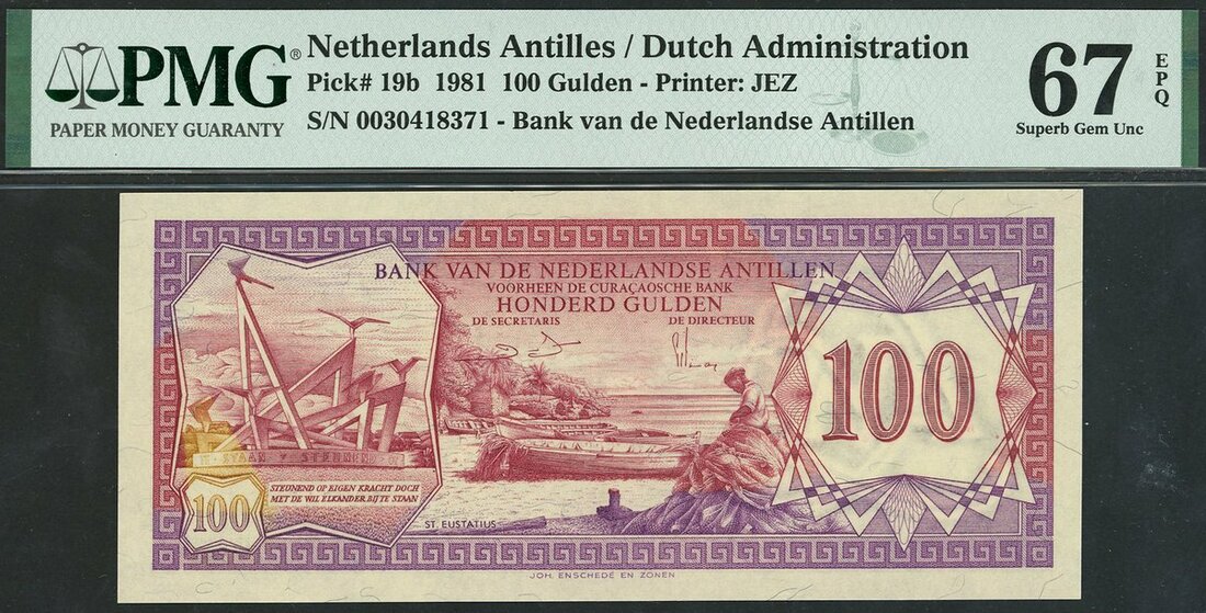 (x) Netherlands Antilles, 100 gulden 9th December 1981, black serial number 0030418371, reddish brown and violet, Statuut monument in Willemstad, Curaçao at left, boats and fisherman with nets on St. Eustatius shore at centre, reverse, coat of armsat centre, prohibition against counterfeiting (in Dutch) at right