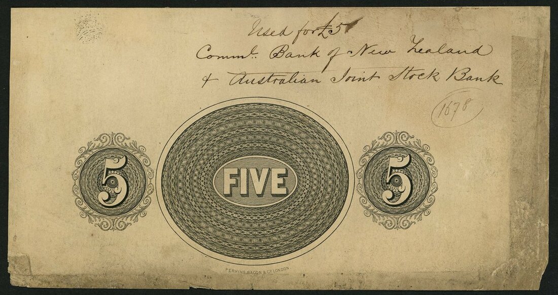(x) Commercial Bank of New Zealand, reverse proof for £5, ND (1860s), annotations at top margin, mounting at margins, fine