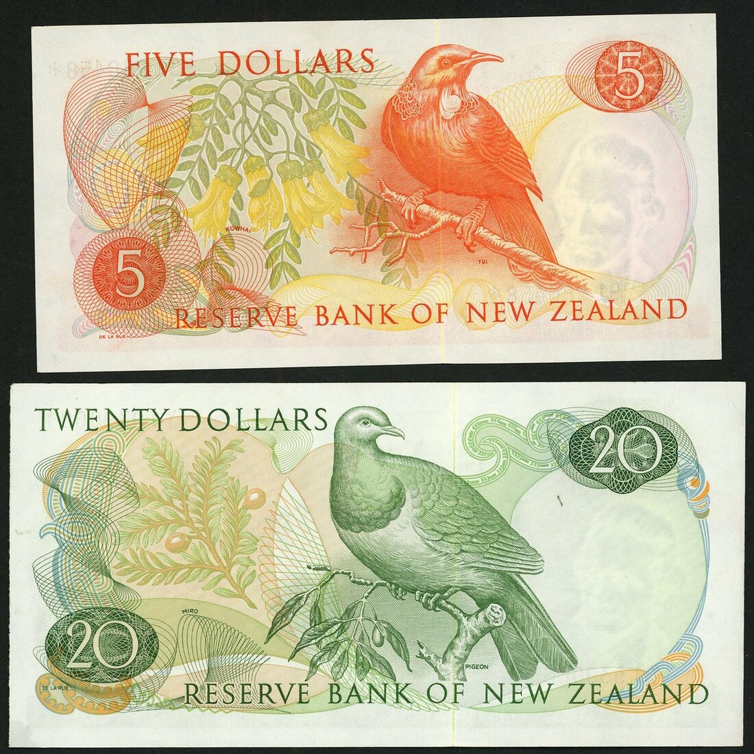 Reserve Bank of New Zealand, a replacement $20, ND (1977-1981), prefix YJ, green, also a replacement $5, prefix 991, red, both Elizabeth II at right, Hardie signature