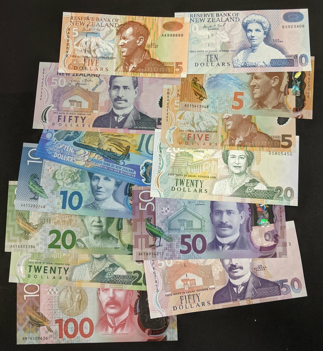 Reserve Bank of New Zealand, a group of the 1992-1994 issue, $5, 10, 20, 50, later issue $5 (2), $10 (2), $20 (2), $50 (2) and $100, 2016