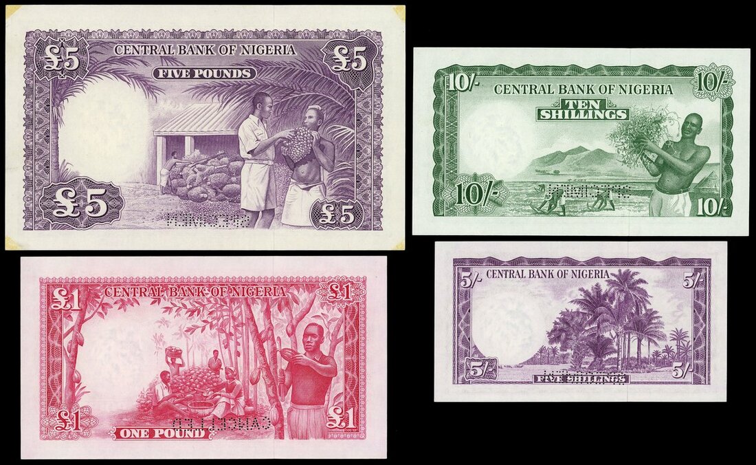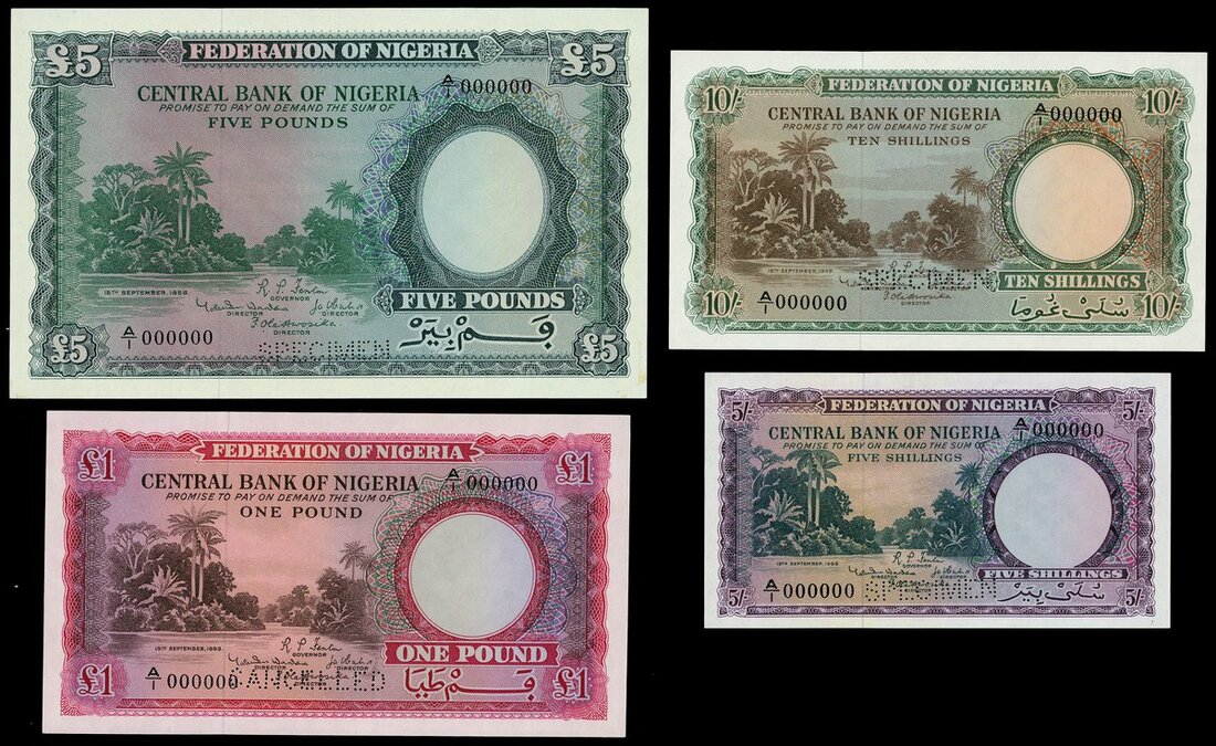 Federation of Nigeria, Central Bank, a set of specimens (4) dated 15 September 1958, all river scene and palm trees at left, comprising 5 Shillings, serial number A/1 000000, purple, reverse palms; 10 Shillings, serial number A/1 000000, green, reverse crop sowing; £1, serial number A/1 000000, red, reverse harvesting cacao; and £5, serial number A/1 000000, blue and green, men harvesting fruit