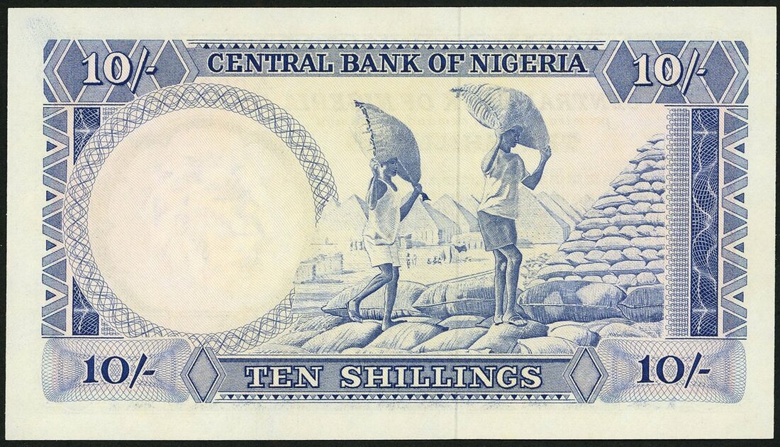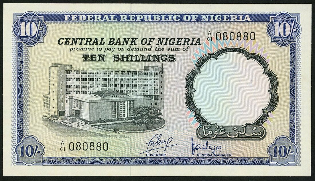 (x) Central Bank of Nigeria, 10 shillings, ND (1968), serial number A/61 080880, (Pick 11a, TBB B210a), about uncirculated