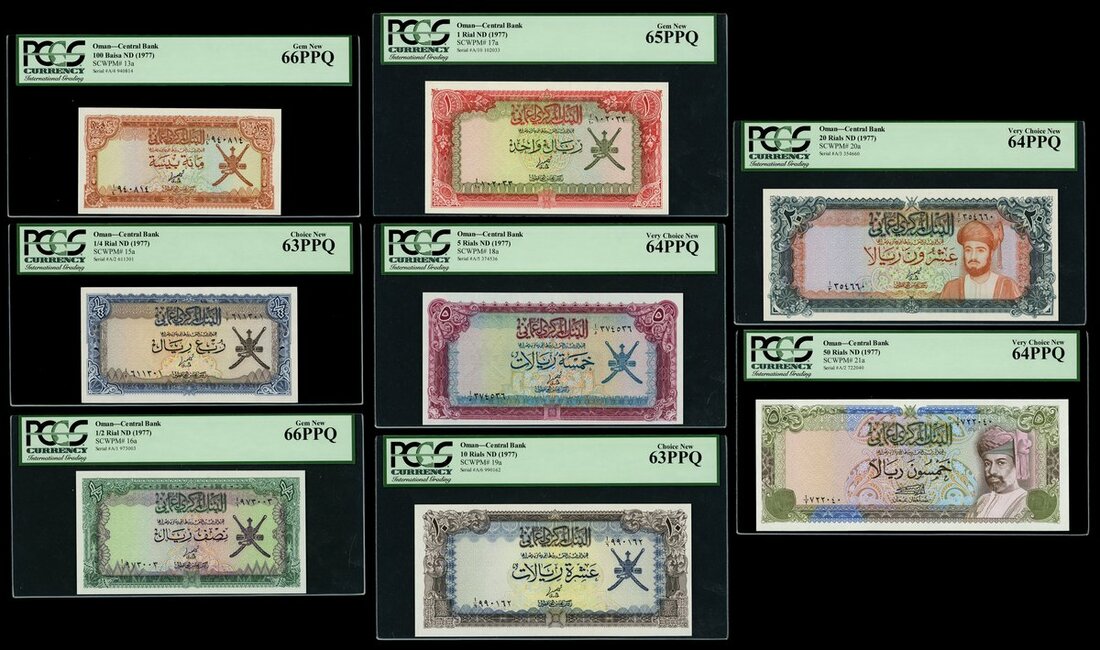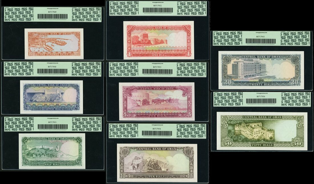 Central Bank of Oman, a set of the 1975 issue, comprising 100 baisa, 1/4, 1/2, 1, 5, 10, 20 and 50 rials, first five with arms at right, last two with Sultan Qaboos at right, reverse, forts and other buildings