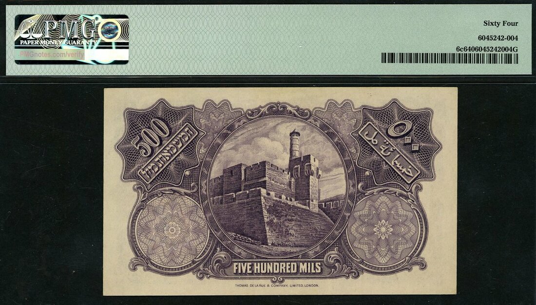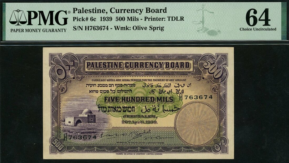 (x) Palestine Currency Board, 500 mils, 20 April 1939, serial number H763674, purple and pale pink-orange, Rachel's Tomb, Bethlehem at left, value at each corner, value in pale green guilloche at centre, three printed signatures of the Members of the Palestine Currency Board, Percy Ezechiel, John Caulcutt and Harold Downie at low centre, reverse purple, the Citadel of Jerusalem with the Tower of David at centre, value at left and right and low centre