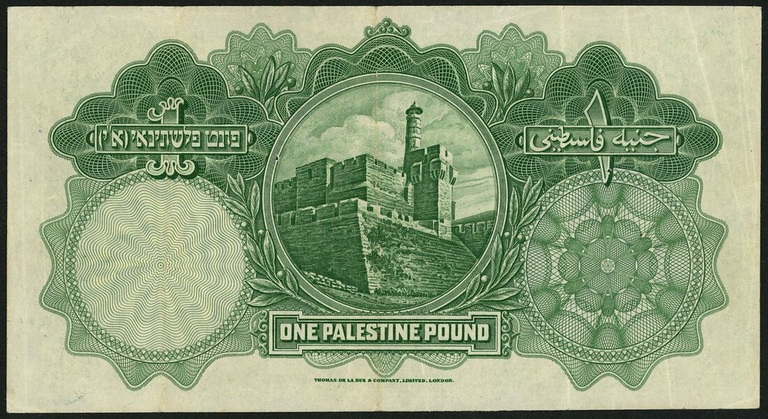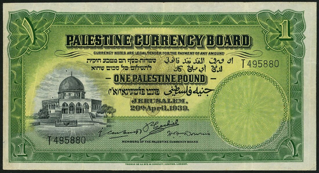 Palestine Currency Board, £1, 20 April 1939, serial number T495880, green, Dome of the Rock at left, reverse, the Tower of David at centre