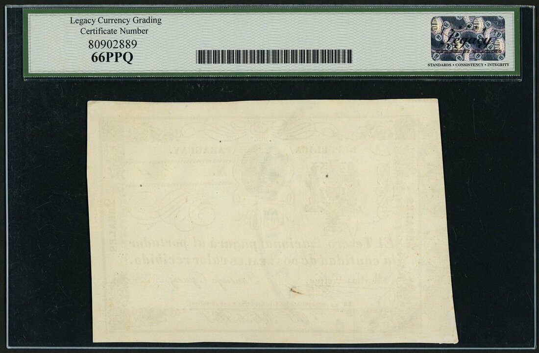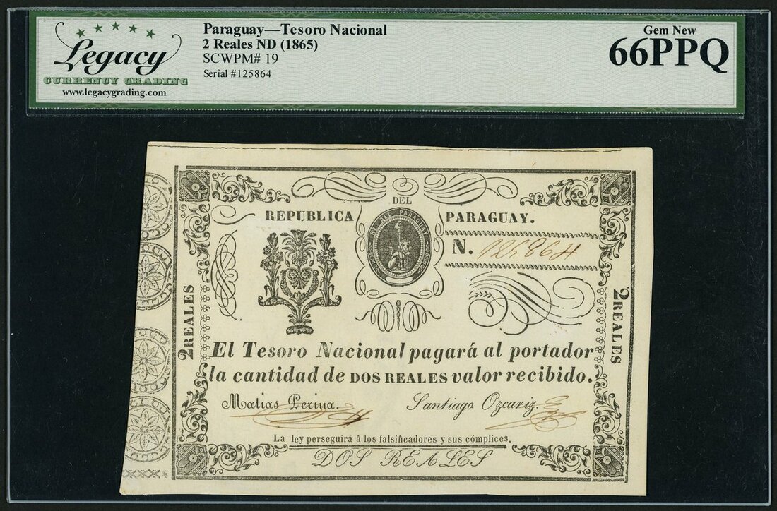 (x) Tesoro Nacional Paraguay, 2 reales, ND (1865), (Pick 19), in Legacy holder 66 PPQ Gem New