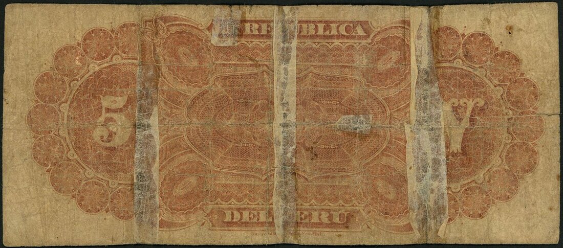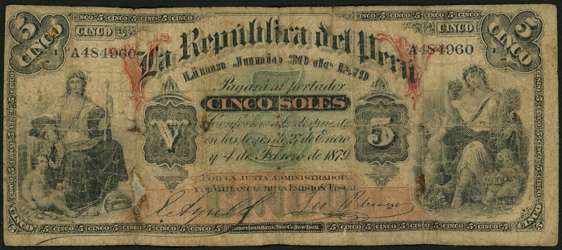 La Republica del Peru, 5 soles, 1879, serial number A484960, (Pick 3), good very good, taped
