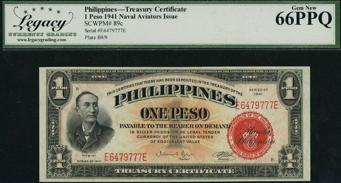(x) Philippines Treasury Certificate, 1 peso, 1941, red prefix E, black and white and pale red, Mabini at left, red seal at right