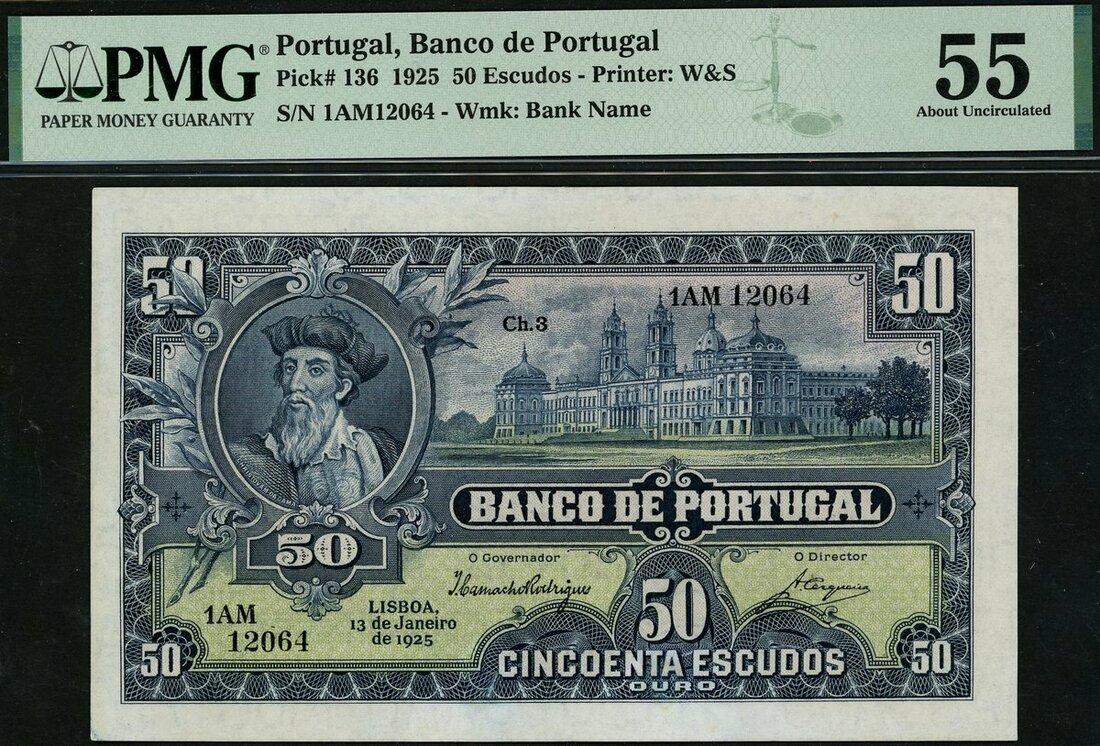 (x) Banco de Portugal, 500 escudos, 13 January 1925, serial number 1AM 12064, blue on light pink and green underprint, portrait Vasco da Gama at left, Monastery of Mafra at centre right