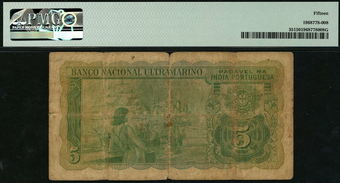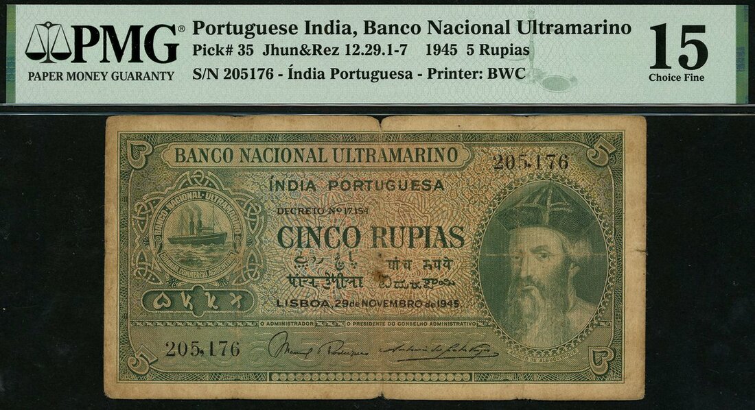 Banco Nacional Ultramarino, Portuguese India, 5 rupias, 29 November 1945, serial number 205176, (Pick 35, Razack-Jhunjhunwalla 12.29.1-7), in PMG holder 15 Choice Fine