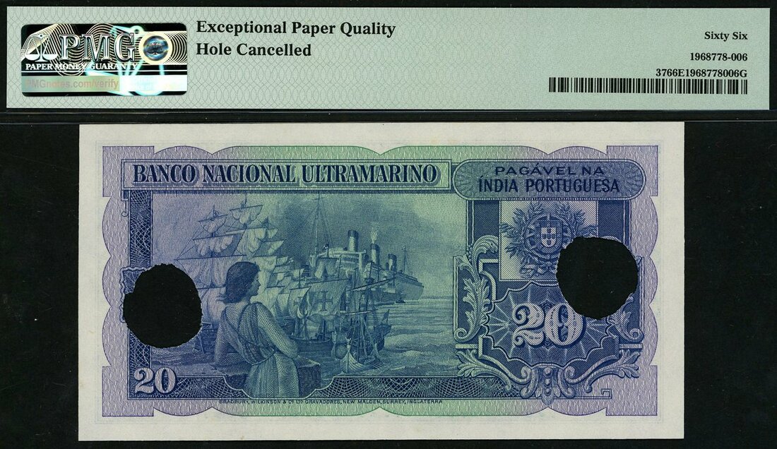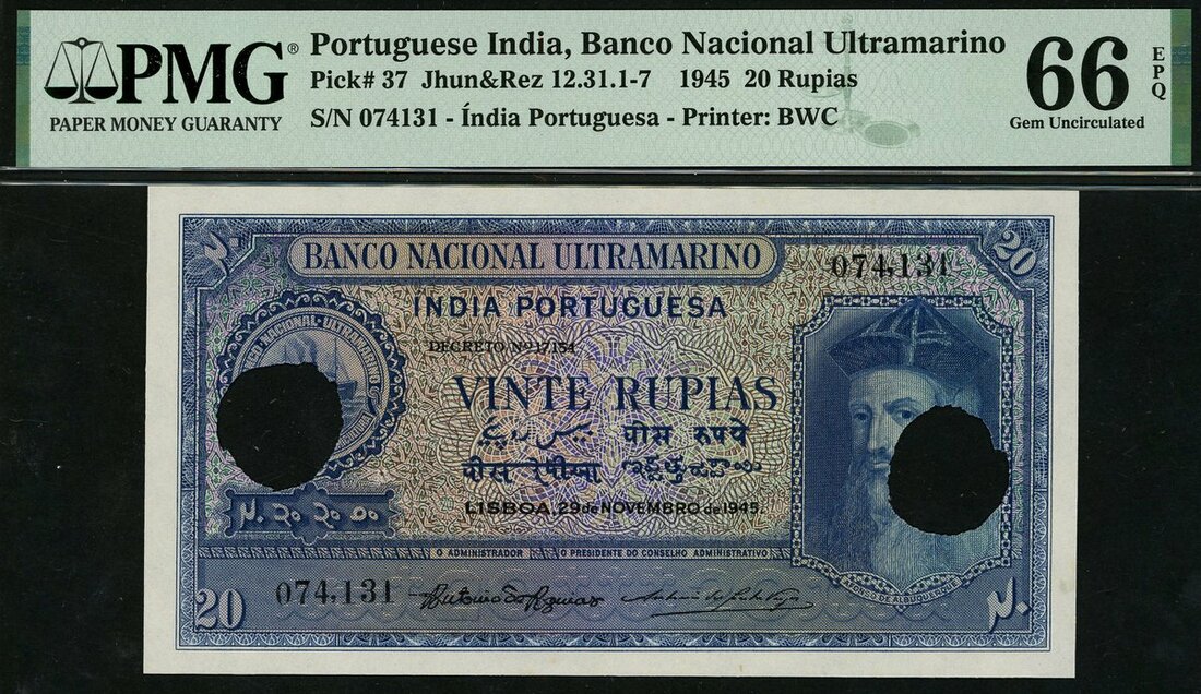 Banco Nacional Ultramarino, 20 rupias 29 November 1945, serial number 074131, (Pick 37, Razack-Jhunjhunwalla 13.31.1-7), PMG Top Pop, 66 EPQ Gem Uncirculated, hole cancelled