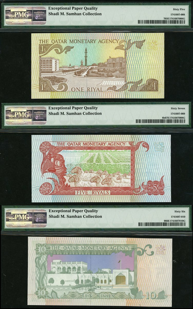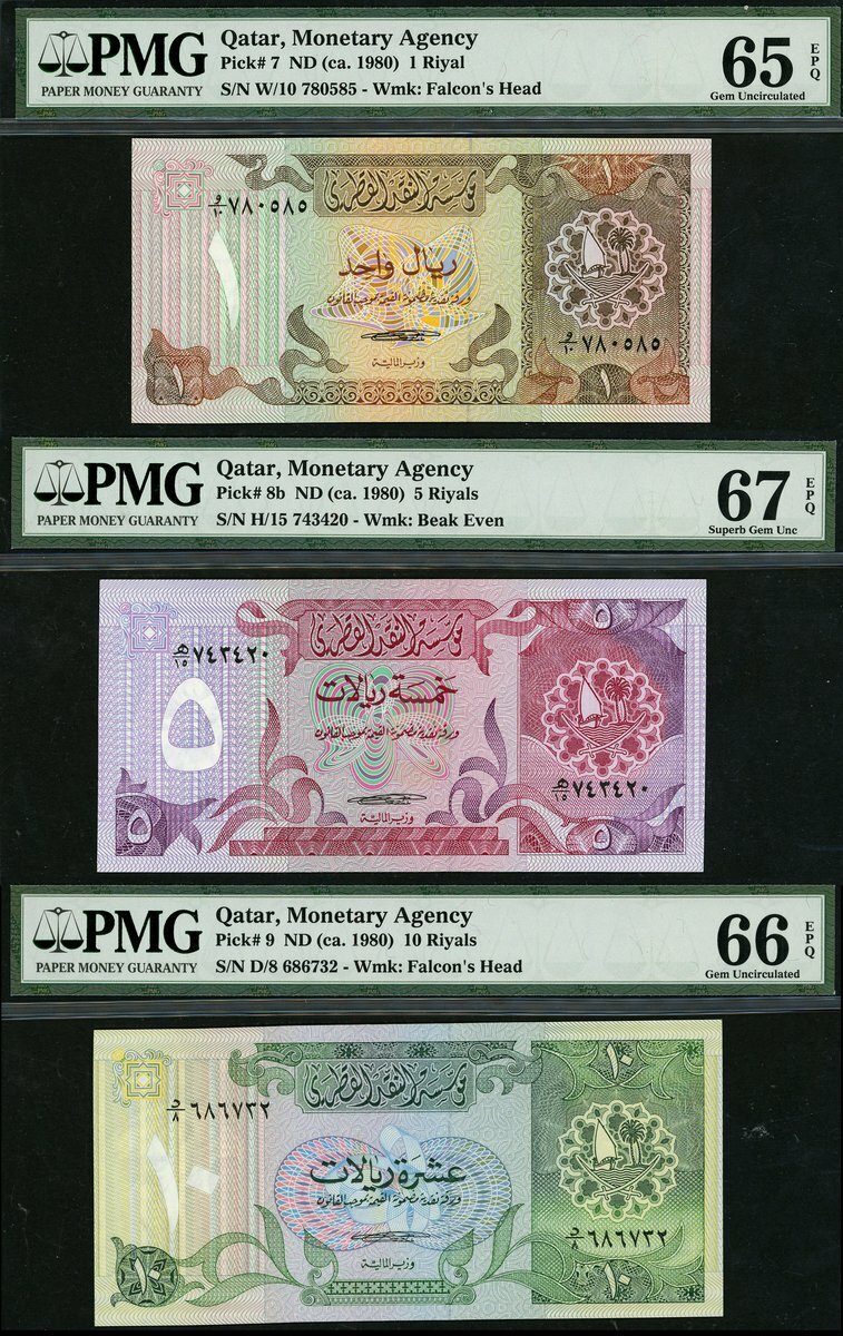 (x) Qatar Monetary Agency, 1 riyal, ND (1973), serial numbers W/10 780585, purple and multicoloured, arms at right, signature of Abdulaziz al-Thani, also 5 riyals, serial number H/15 743420, purple also 10 riyals, serial number D8 686732, green