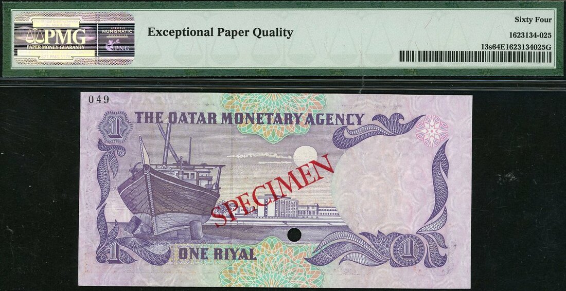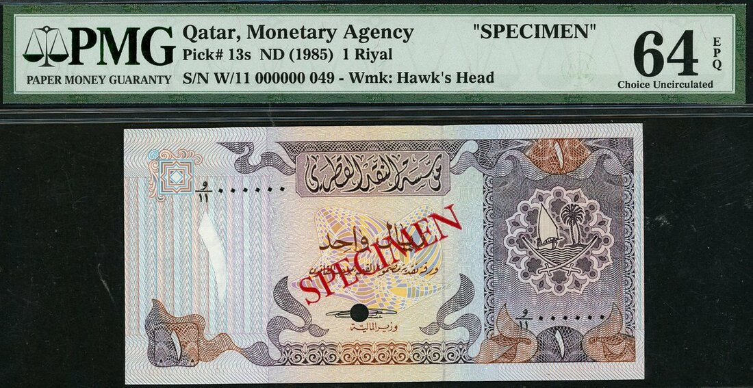 (x) Qatar Monetary Agency, specimen 1 Riyal, ND (1985), serial number W/11 000000, brown on multicolour, arms at right, reverse dhow at left, Ministry of Finance building (Emir's Palace) in background at centre, diagonal red overprint SPECIMEN on obverse and reverse centre,