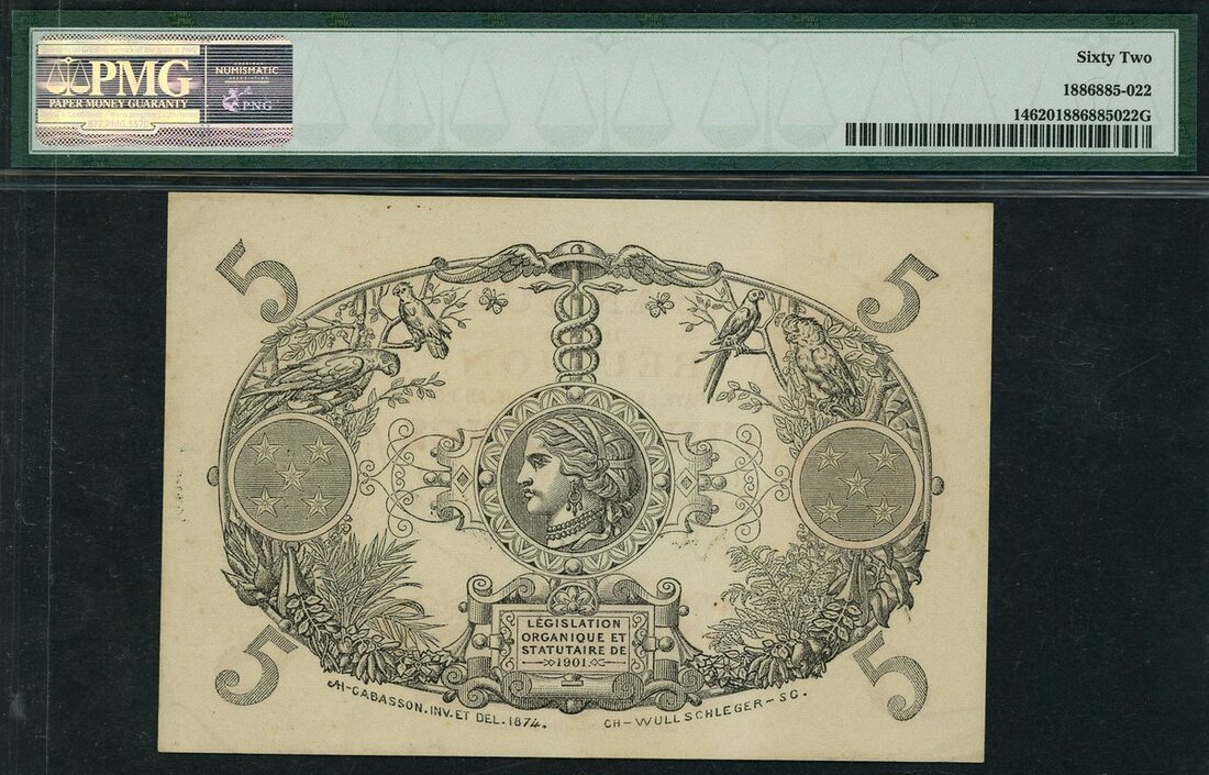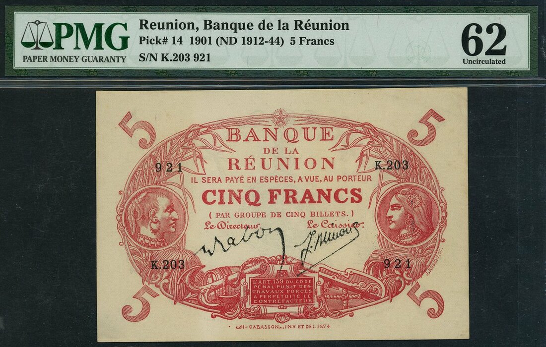 Banque de la Reunion, 5 francs, ND (1912-44), serial number K.203921, red print, medallic heads at left and right