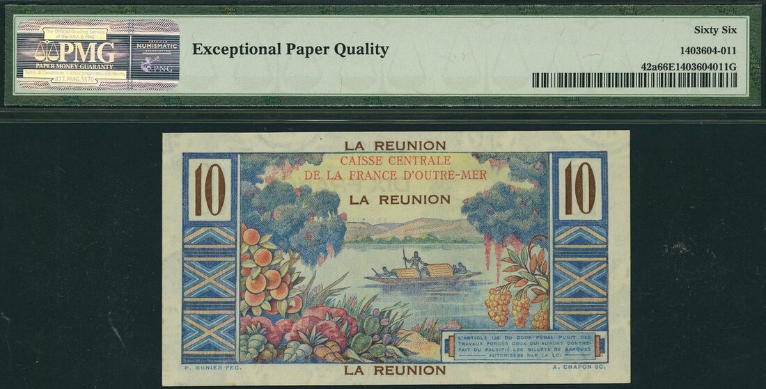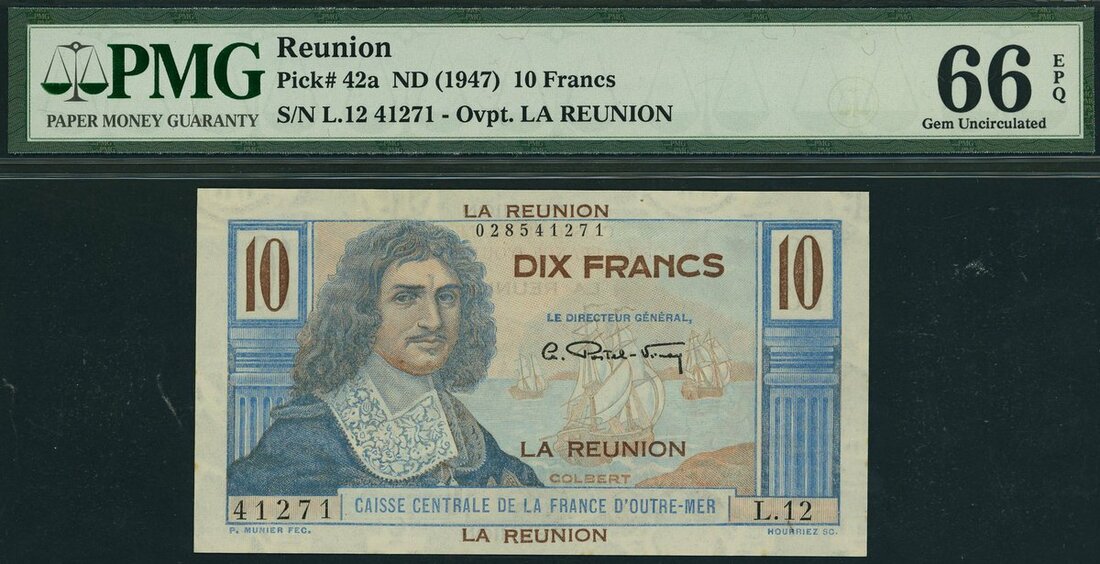 Caisse Centrale de la France d'Outre Mer, (Reunion), 10 francs, ND (1947), serial number L.12 41271, (Pick 42a), PMG Top Pop, 66EPQ Gem Uncirculated, other closest grade being 64EPQ, scarce in high grade