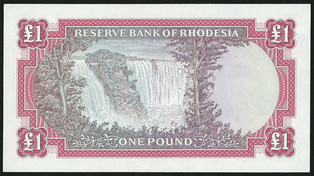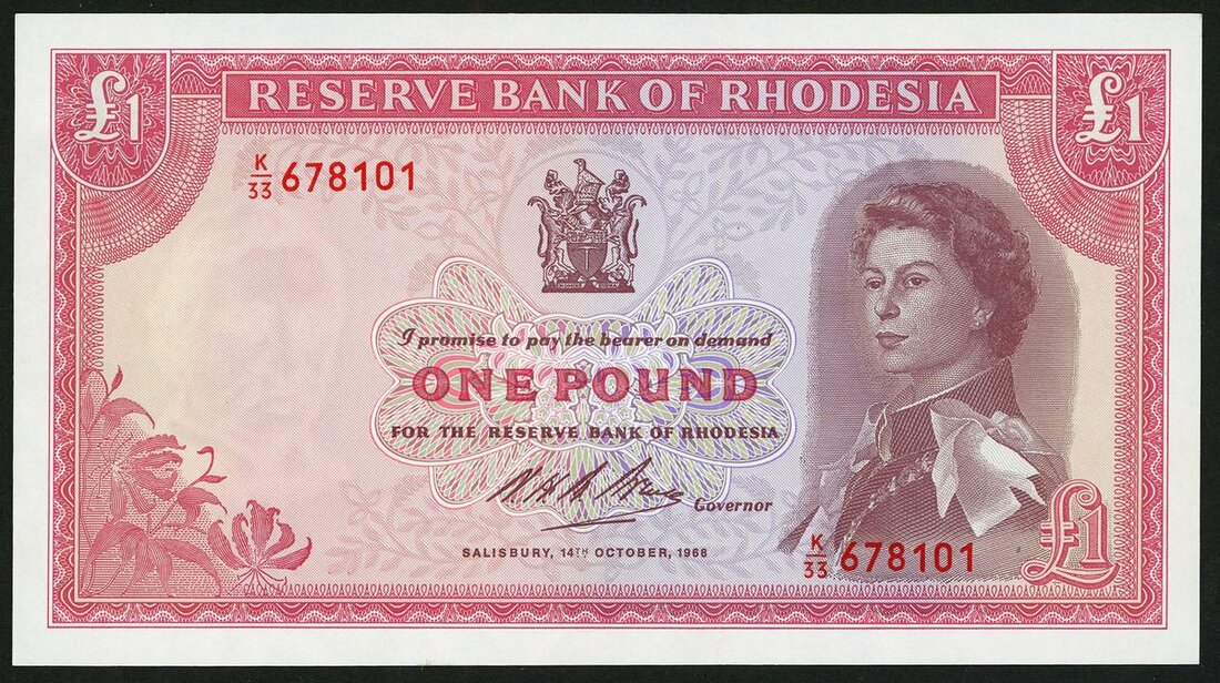 Reserve Bank of Rhodesia, £1, 14 October 1968, serial number K/33 678101, red on multicolour underprint Elizabeth II at right, arms at top centre, Bruce signature