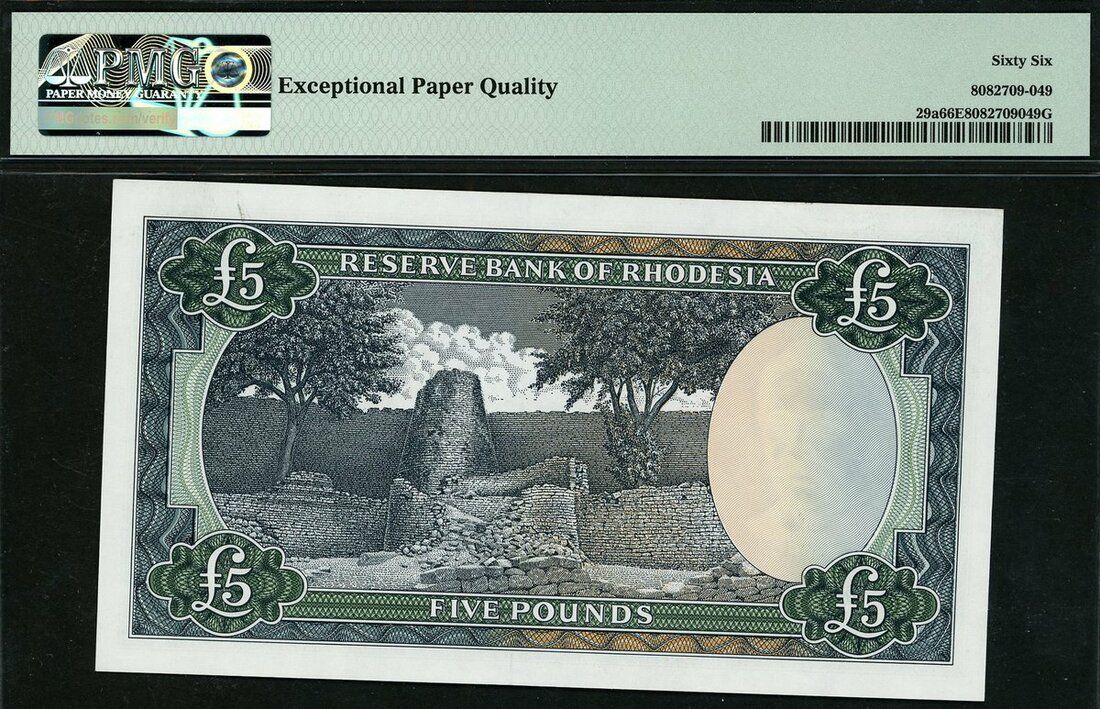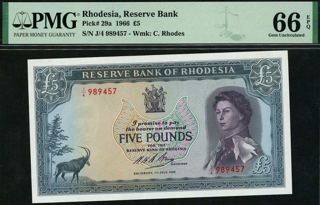 (x) Reserve Bank of Rhodesia, £5, 1 July 1966, serial number J/4 989457, blue-grey, Elizabeth II at right, Sable antelope at left, arms top centre, Bruce signature