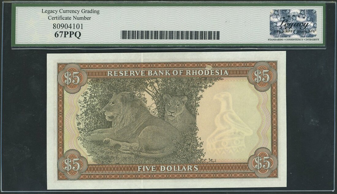 (x) Reserve Bank of Rhodesia, $5, 1979, red prefix M/23, brown, giraffe at left, arms at right