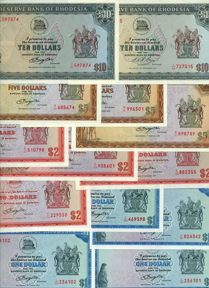 Reserve Bank of Rhodesia, including $1 (4), 1976, 1978, 1979, $2 (4), 1976, 1977, 1979, $5 (3), 1976, 1978, 1979, $20 (2), 1978, 1979,