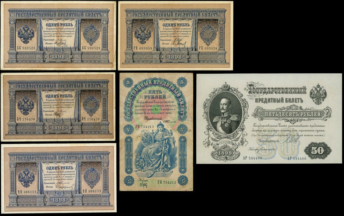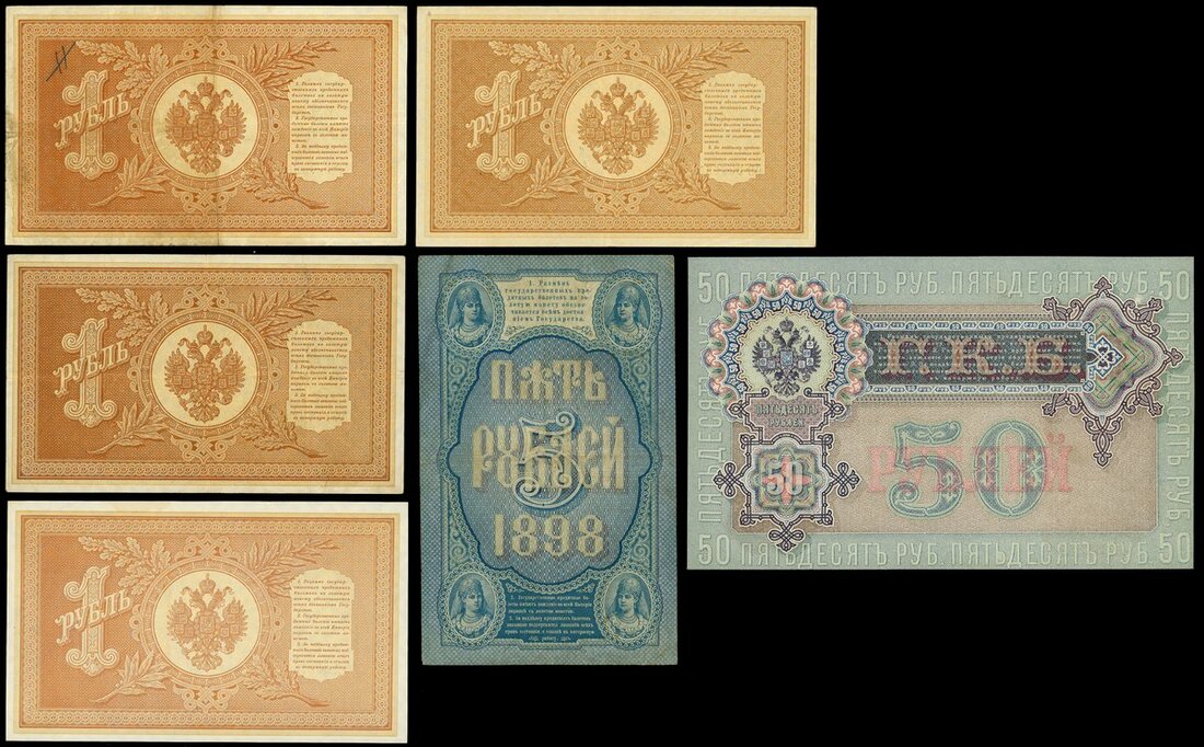 Russia, State Credit Notes, 1 ruble (4), 5 rubles, 50 rubles (1898-1899), (Pick 1a, 1, 1b, 1d, 3b, 8d, Ryabch 700, 701, 703, 707, 721), good extremely fine to about uncirculated (6 notes)