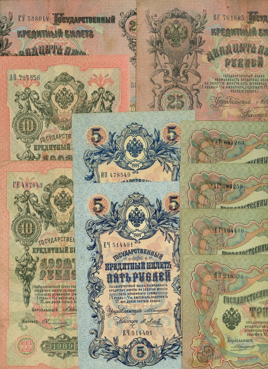 Russia, State Credit Notes, 3 rubles (4), 5 rubles (3), 10 rubles (3), 1905-1909, (Pick 9a, 9b, 9c, 10a, 10b, 10b, 11a, 11b, 11c, Ryabch 722, 722, 724, 724, 726, 727, 727, 729, 730, 731), fine to about uncirculated (10 notes)