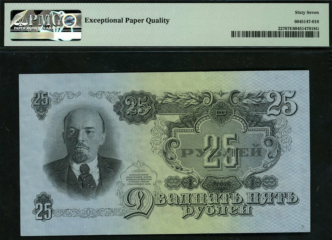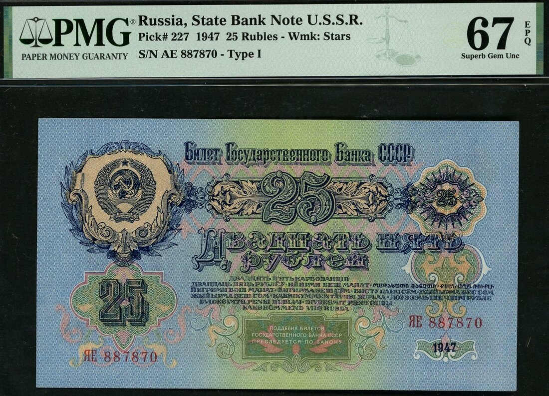(x) State Bank Note U.S.S.R., Russia, 25 rubles, 1947, serial number AE 887870, (Pick 227), Top Pop! In PMG holder 67 EPQ Superb Gem Unc, rare in this grade