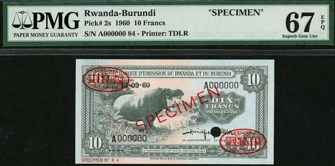 Banque d'Emission du Rwanda et du Burundi, specimen 10 francs, 15 September 1960, (Pick 2s, TBB B PMG Top Pop, 67 EPQ Superb Gem Uncirculated, rare
