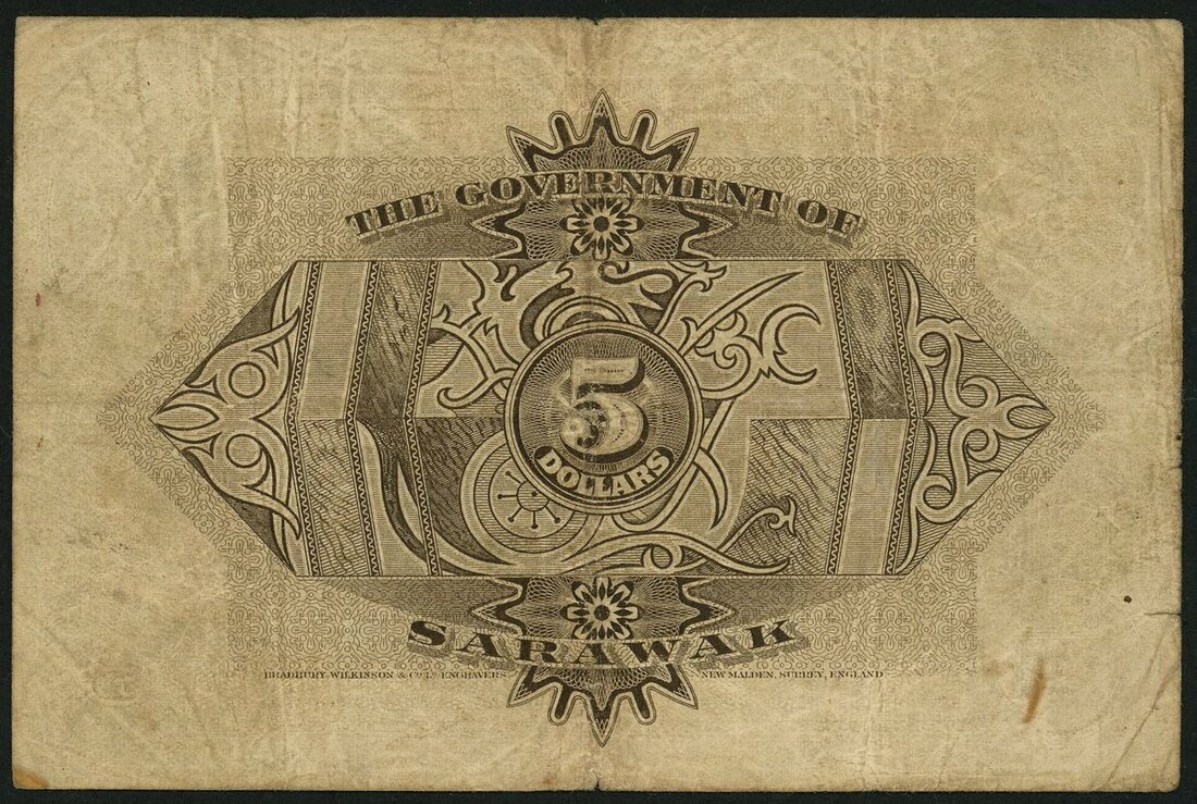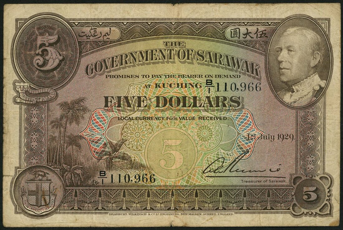 Government of Sarawak, 5 dollars, 1 July 1929, serial number B/1 110,966, (Pick 15, TBB B214a, Goon p.161 SW29A), first date, pressed, splits at margins, fine, nevertheless scarce