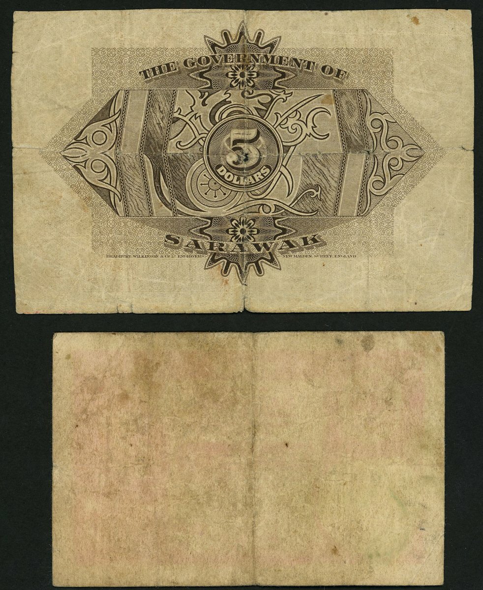Government of Sarawak, 10 cents, 1940, red and $5, 1929, brown, both Charles Vyner Brooke at right