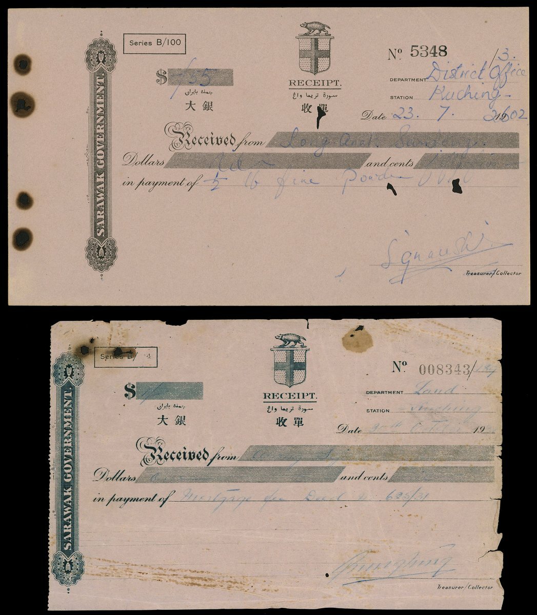 Sarawak Government receipts, (19--), one receipt for 1/2 lb of rice powder,