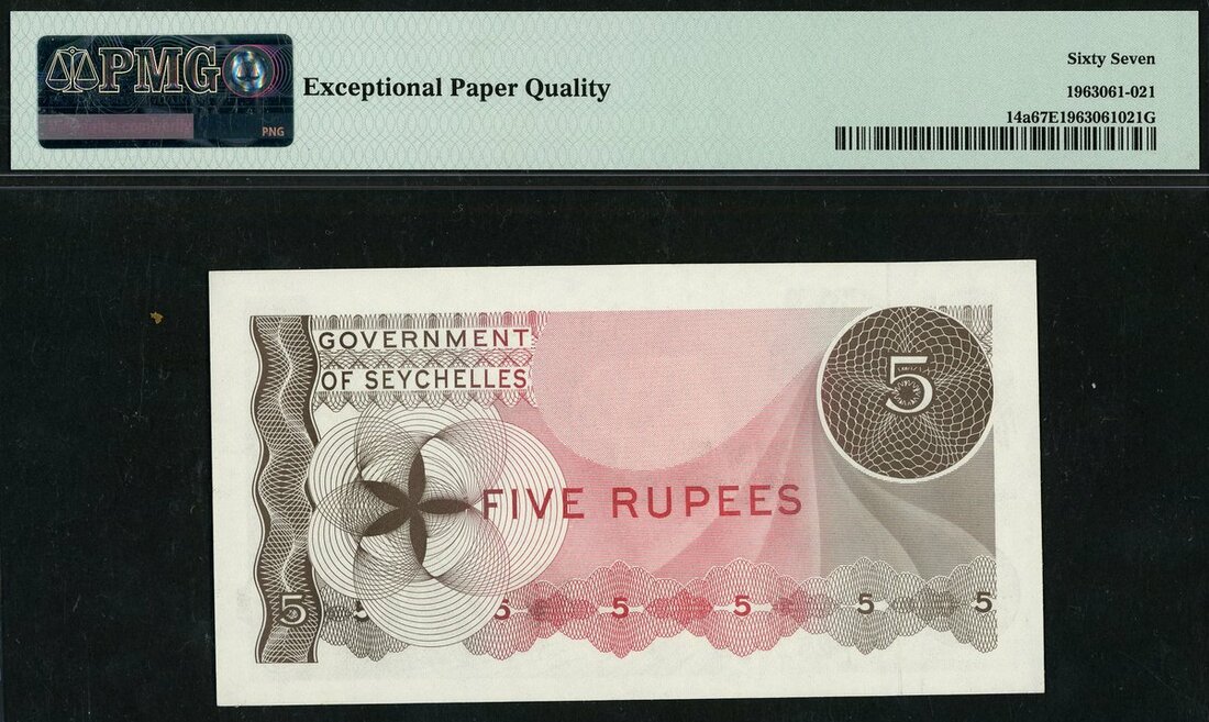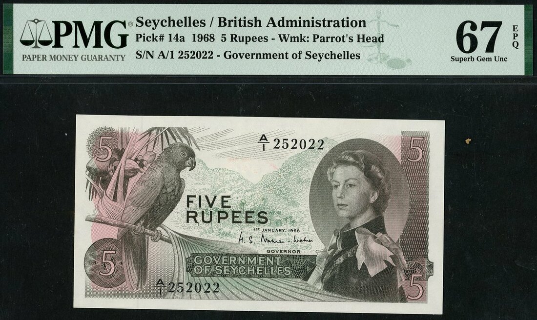 (x) Seychelles Government issue, 5 rupees, ND (1968), serial number A/1 252022, grey and purple, parrot at left, Elizabeth II at right
