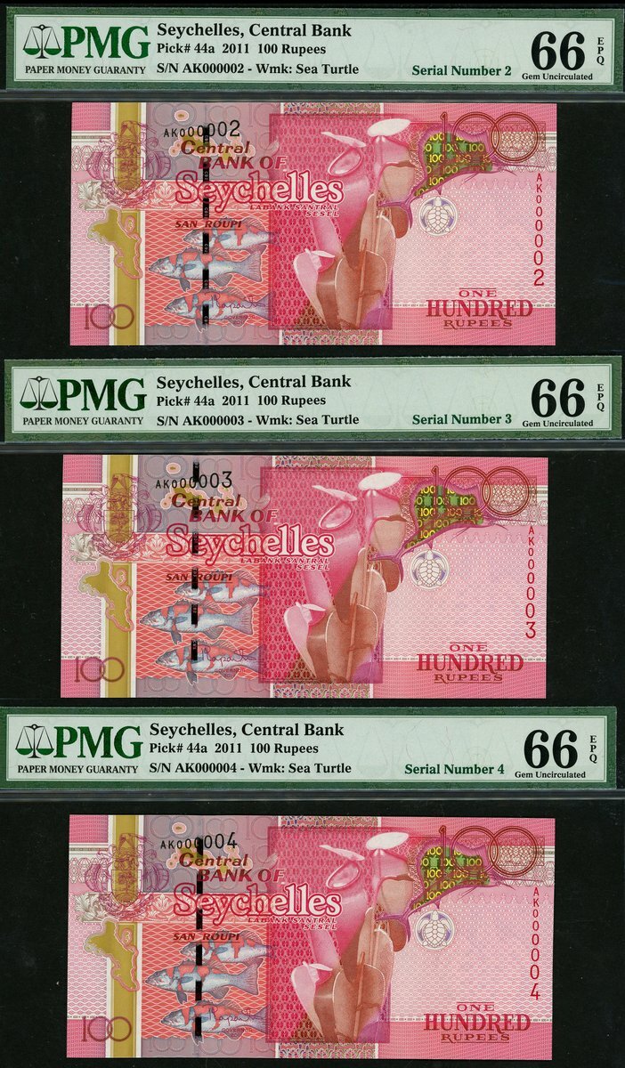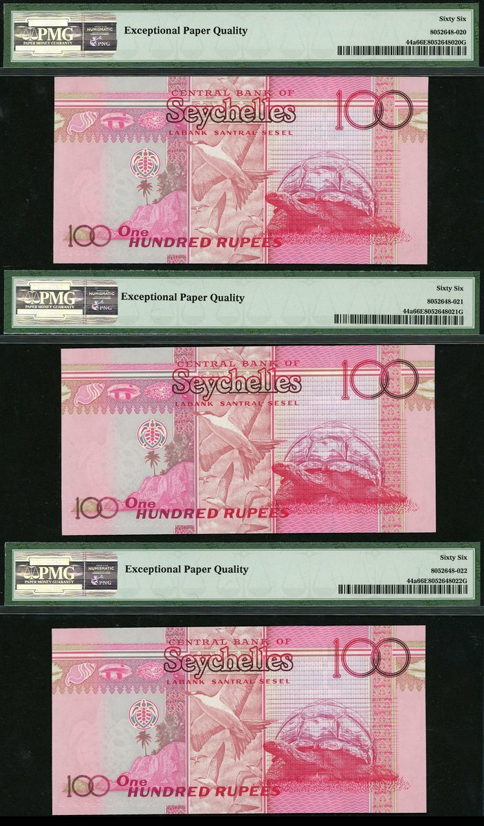 (x) Central Bank of Seychelles, consecutive 100 rupees (3), 2011, serial number AK 000002/3/4, (Pick 44a, TBB B417a), all in PMG holders 66 EPQ Gem Uncirculated (3 notes)