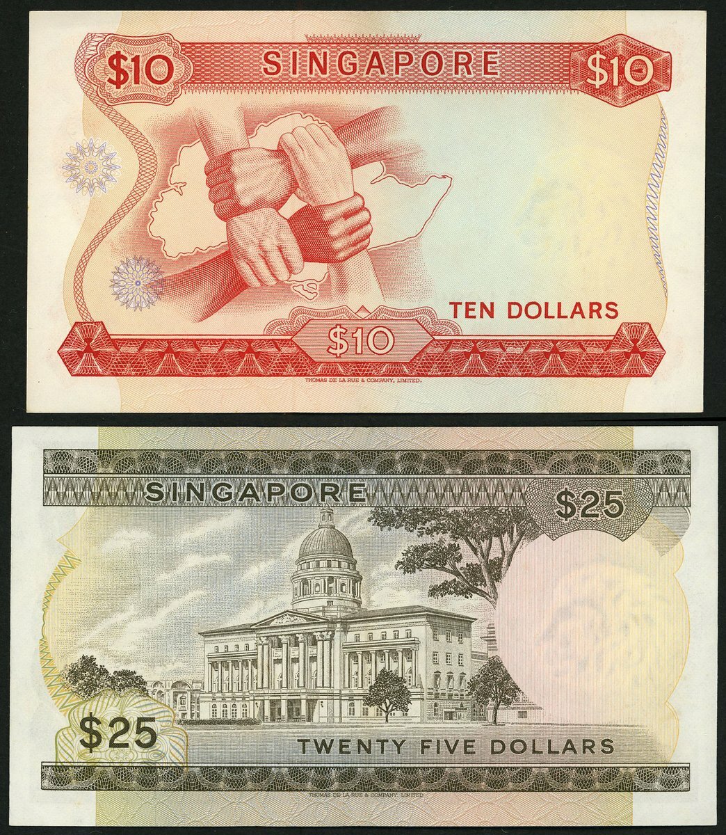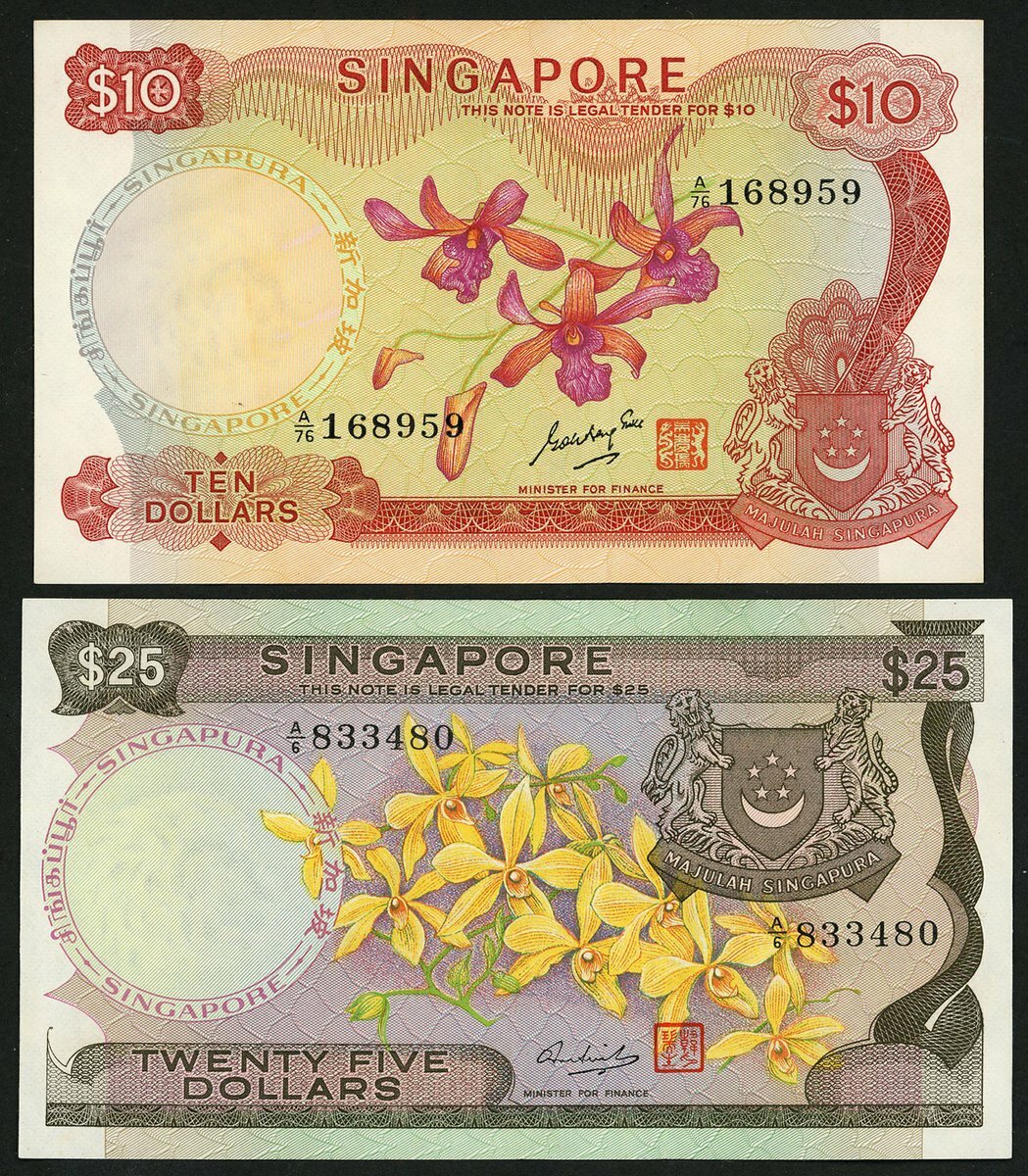 Board of Commissioners of Currency Singapore, $10, $25, ND (1967-73), prefixes A/76, A/6, (Pick 3b, 4, TBB B103b, B104a), $10 unc, $25 EF (2 notes)