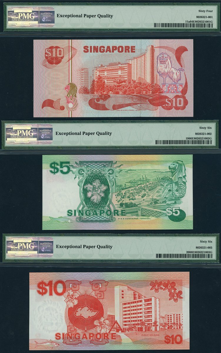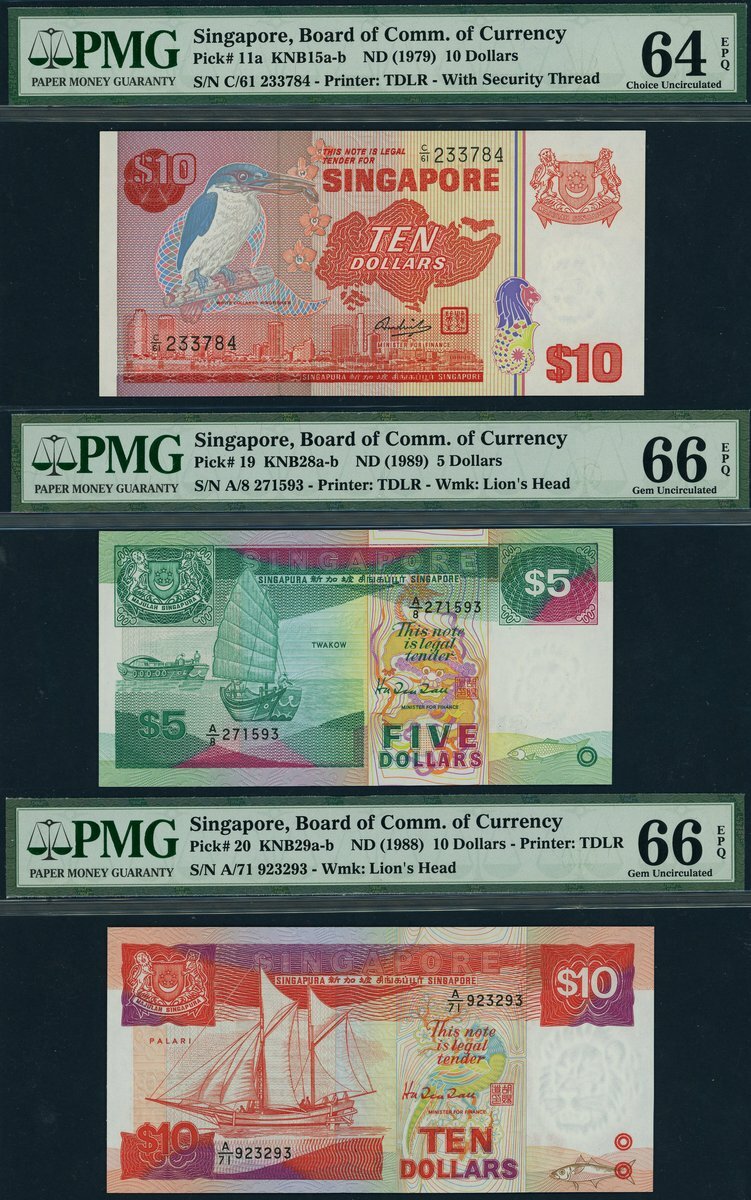 (x) Board of Commissioners of Currency, Singapore, 10 dollars, ND (1979), 5 and 10 dollars, ND (1988-89), (Pick 11a, 19, 20, TBB B112, B121, B122), in PMG holders 64 EPQ, 66 EPQ, 66 EPQ (3 notes)